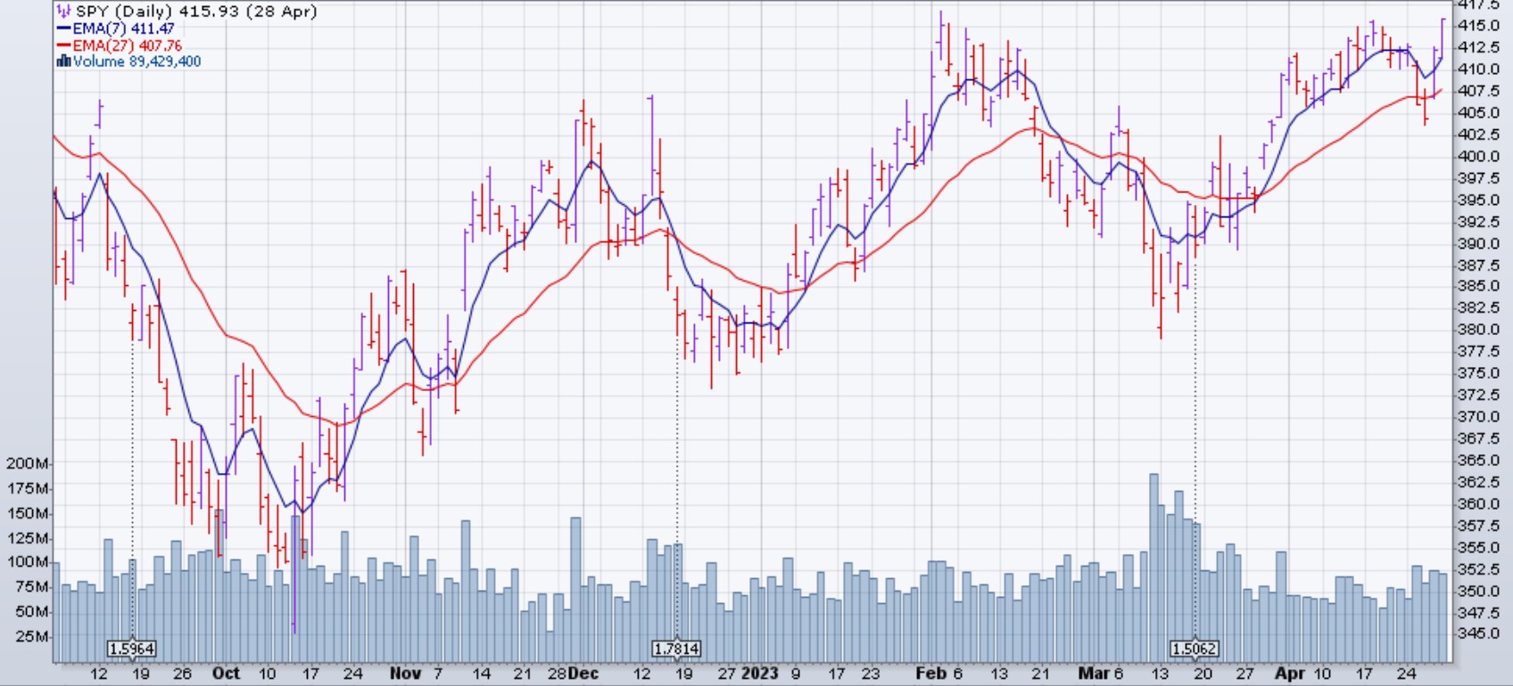 Le marché (SPX et dérivés) est monté de 0.9% la semaine du 24 avril 2023. Le léger gain de la semaine est survenu alors que les résultats financiers du premier trimestre meilleurs que prévu de certaines entreprises l'emportaient sur les rapports décevants d'autres. Les données économiques semblaient aller dans la bonne direction, mais comportaient quelques mises en garde. Le produit intérieur brut du premier trimestre a montré que l'économie américaine a progressé au dernier trimestre, mais seulement de 1,1 %, ce qui était bien inférieur à l'expansion de 2,6 % du quatrième trimestre. La lecture a manqué les attentes d'un taux de croissance de 2 %. La croissance d'une année sur l'autre de l'indice des dépenses de consommation personnelle de base a ralenti à un taux de 4,6 % en mars, contre 4,7 % le mois précédent, mais cela reste bien au-dessus de l'objectif de 2 % de la Réserve fédérale.