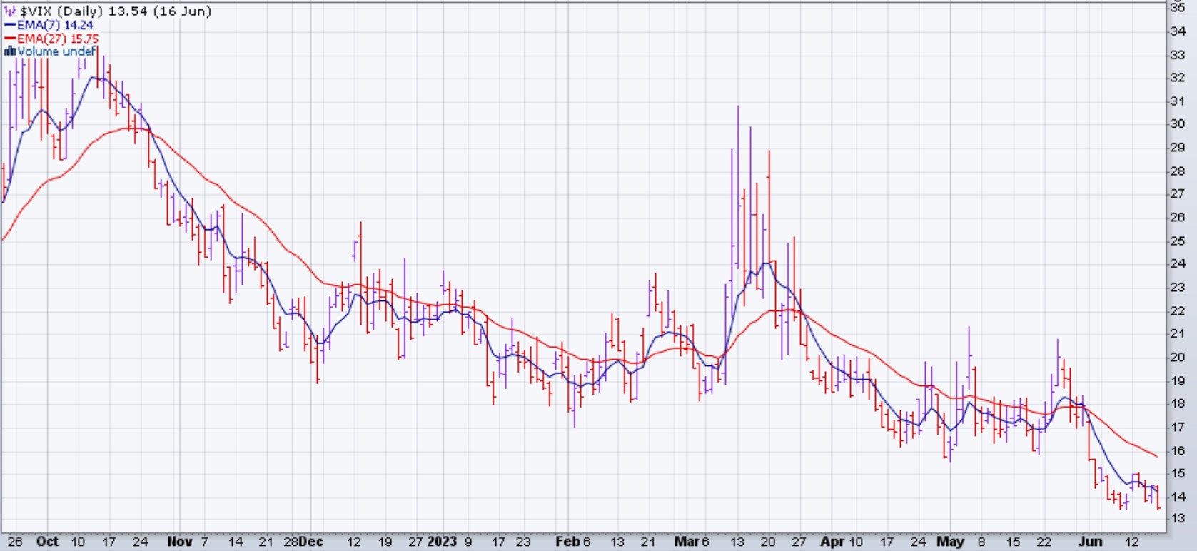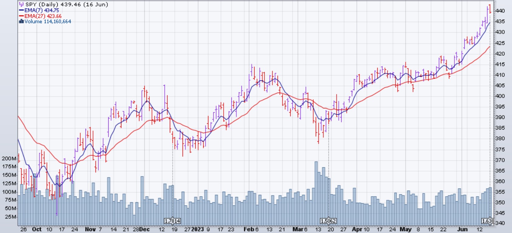 Le marché (SPX et dérivés) est monté de 2.6% la semaine du 12 juin 2023. L'avance de la semaine est survenue alors que les données économiques continuaient d'être supérieures aux attentes, y compris un rapport montrant que les ventes au détail aux États-Unis ont augmenté de manière inattendue sur une base mensuelle en mai, tirées par les véhicules à moteur et les matériaux de construction. Les investisseurs ont également reçu un coup de pouce lorsque le Federal Open Market Committee, qui avait relevé les taux pendant 10 réunions consécutives jusqu'en mai, a choisi de maintenir les taux stables lors de sa réunion de juin qui s'est terminée mercredi. Cela devrait représenter une pause dans les hausses de taux plutôt que la fin de celles-ci, mais les investisseurs ont été soulagés de voir les taux se maintenir pour la première fois depuis plusieurs réunions.
