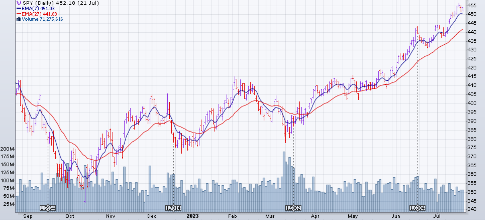 Le SPY continu de monté depuis que ses EMA se sont croisées en mars. Il est actuellement seulement 5% plus bas que son haut historique.