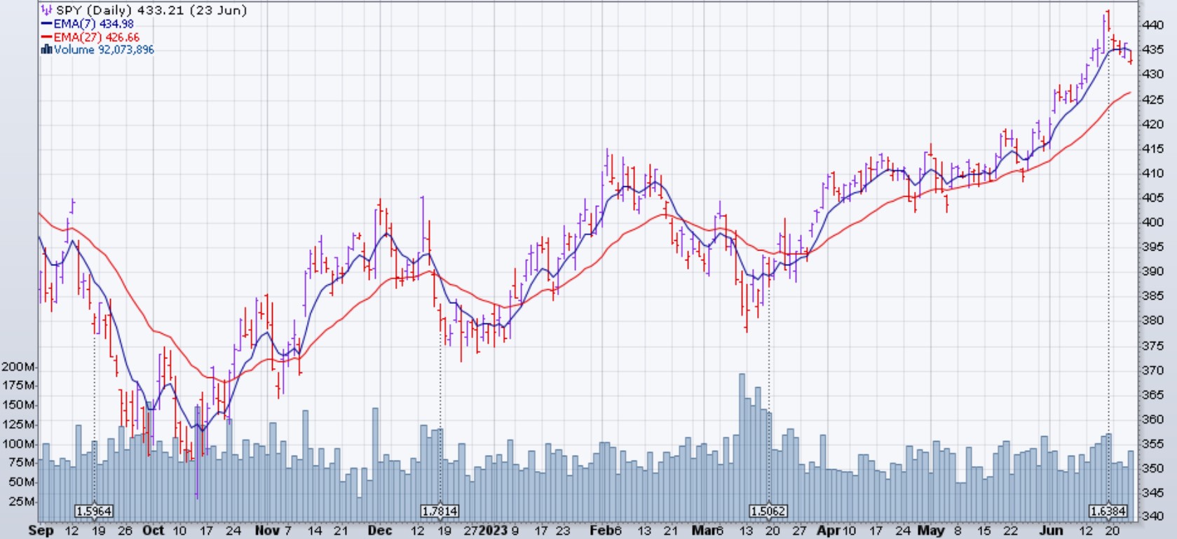 Le marché (SPX et dérivés) est descendu de 1.4% % la semaine du 19 juin 2023. La baisse hebdomadaire est intervenue alors que le président de la Réserve fédérale, Jerome Powell, a déclaré lors d'une audience du comité sénatorial des banques qu'"il reste encore un peu de chemin à parcourir avec des hausses de taux" suite à la décision du comité fédéral de l'open market de maintenir les taux stables la semaine dernière après 10 augmentations consécutives. Ajoutant aux inquiétudes, la gouverneure de la Réserve fédérale, Michelle Bowman, a déclaré qu'elle soutenait la décision du Federal Open Market Committee de laisser les taux d'intérêt stables, mais que de nouvelles augmentations seront nécessaires pour ramener l'inflation au taux cible de l'agence. Les investisseurs craignent que de nouvelles hausses ne ralentissent trop l'économie.