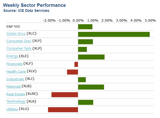 Les services de communication ont enregistré la plus forte augmentation hebdomadaire, en hausse de 6,8 %, suivis d'une augmentation de 1,8 % dans les matériaux et d'une hausse de 1,7 % dans l'énergie. Parmi les autres secteurs qui ont progressé, mentionnons la technologie, la consommation discrétionnaire, la consommation de base et les industries. Quatre secteurs ont affiché des baisses hebdomadaires : les services publics ont perdu 2,1 %, l'immobilier a perdu 1,8 %, les soins de santé ont chuté de 0,8 % et les services financiers ont légèrement baissé de 0,2 %. Les gagnants des services de communication ont été menés par la société mère de Facebook Meta Platforms (META) et la société mère de Google Alphabet (GOOGL), qui ont bondi de 11 % chacune.