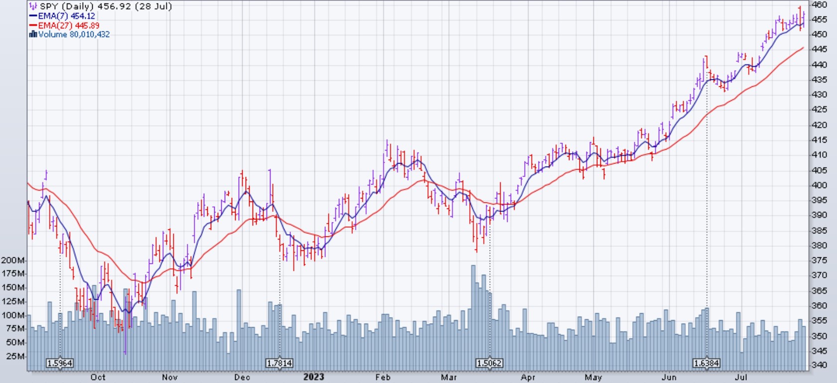 Le marché (SPX et dérivés) est monté de 1% la semaine du 21 juillet 2023. L'avance de la semaine a été limitée par les inquiétudes concernant la future politique des taux alors que le Federal Open Market Committee de la Réserve fédérale a relevé son taux directeur. Le coup de pouce, alors qu'il n'était que d'un quart de point de pourcentage, fait suite à une pause dans les hausses de taux le mois dernier et a conduit à davantage de questions sur ce qui pourrait être à venir pour la politique de la Fed.