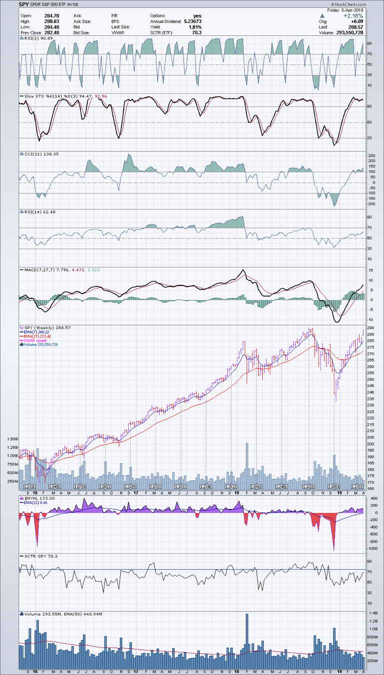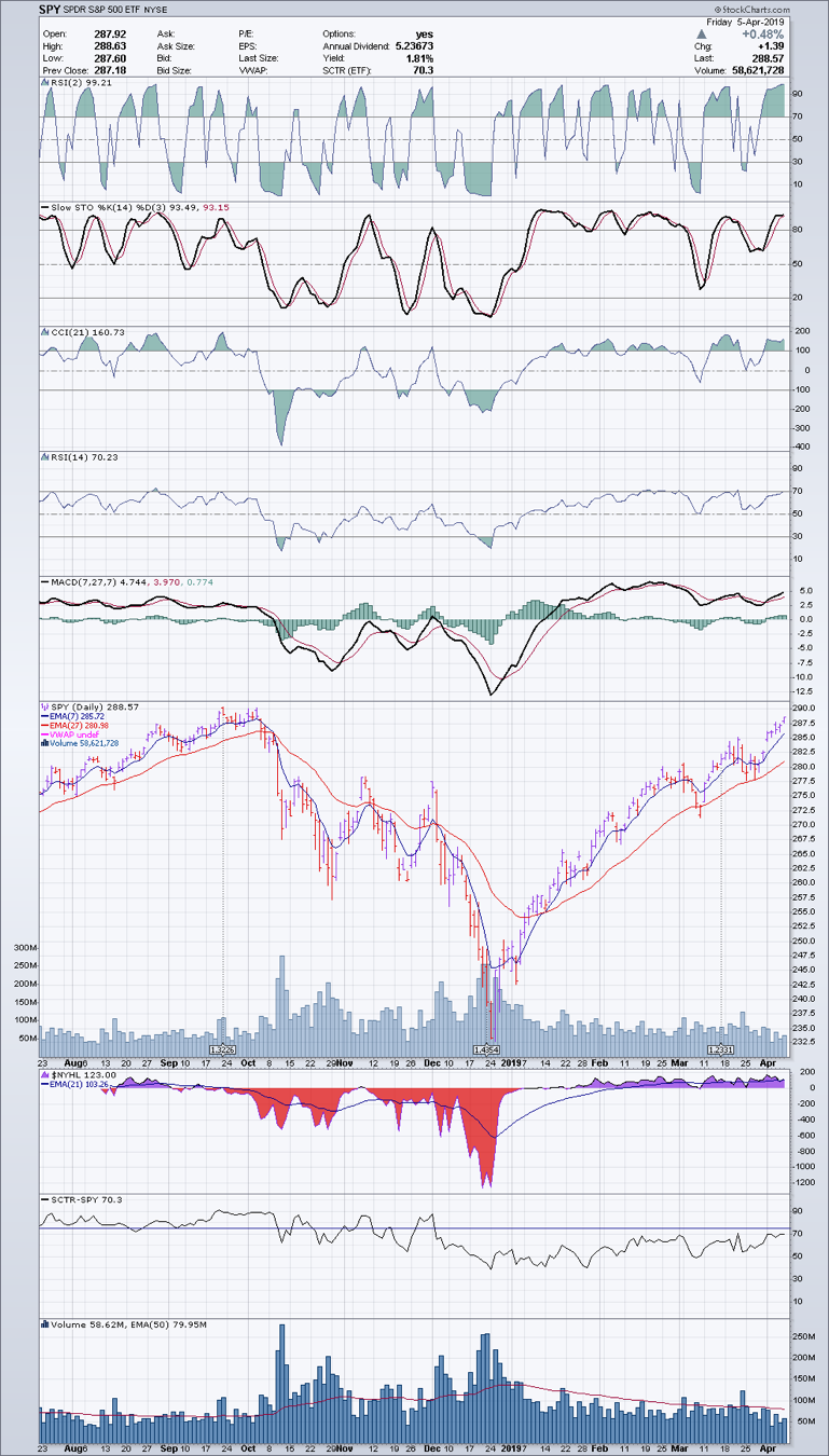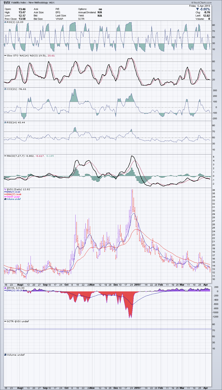 The SPY sailed the fourteenth week of 2019 with good tailwinds that ended Friday with a gain of 2.1%. The VIX (see charts 3) is at 12.5%, a level more positive but still not the best for trading comfortably. The best is a VIX at about 10%. We start to enter in the market progressively, as the market keeps its positive bias.