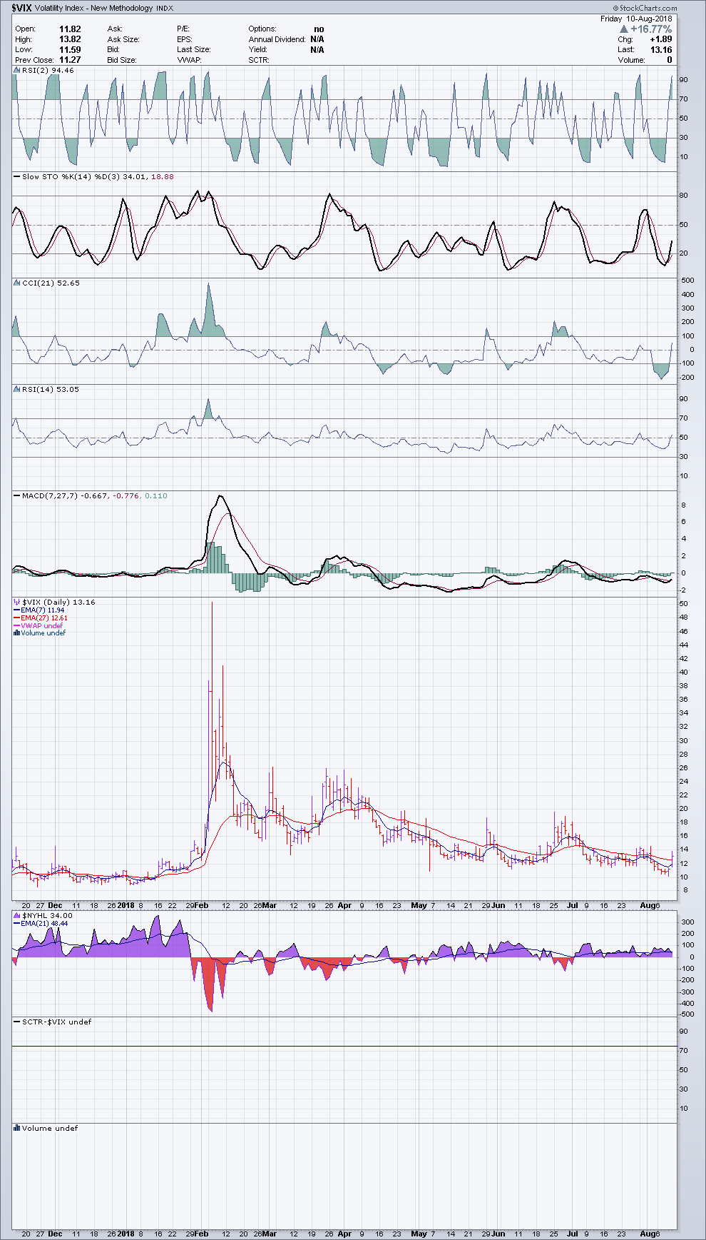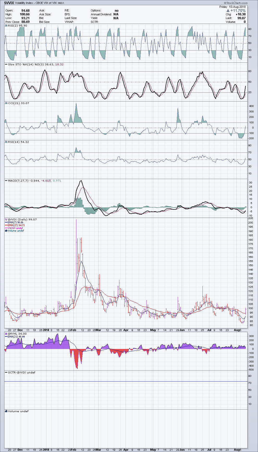 The SPY sailed the thirty-fourth week of 2018 with headwinds that stopped initially the progress of price at practically the same price as on January 26, the historic high, ending the week with a drop to the level of the previous Friday. The VIX is low but of Friday did an uncomfortable spike (when VIX goes down the SPY goes-up and vice versa – see chart n. 3). The volatility of VIX (VVIX – chart 4) show the fluctuations of VIX and made also a surge.