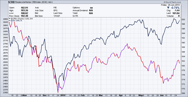 In the following daily chart we see the SPX Index compared to the price of Commodities (the CRB Index), As the price of commodities goes down this means the US dollar (that prices them worldwide) is weakening. Graphically, it seems as the price of commodities goes up this is good for the stock market.