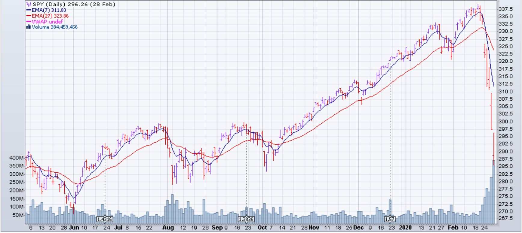 The SPY opened on Monday with a negative gap of around 10 points. Tuesday, it continued falling resulting in the moving averages (EMA 7,27) crossing negatively. Wednesday, the market seemed as if it had consumed it's correction since it closed at the same level as Tuesday's close but Thursday and Friday it continued its fall. Technically speaking, the Friday before the crash, certain indicators were diverging from the price graph of the SPY indicating a certain correction to come. However, nothing indicated the severity of this correction. In Finance, we refer to moments like this as Acts of God.