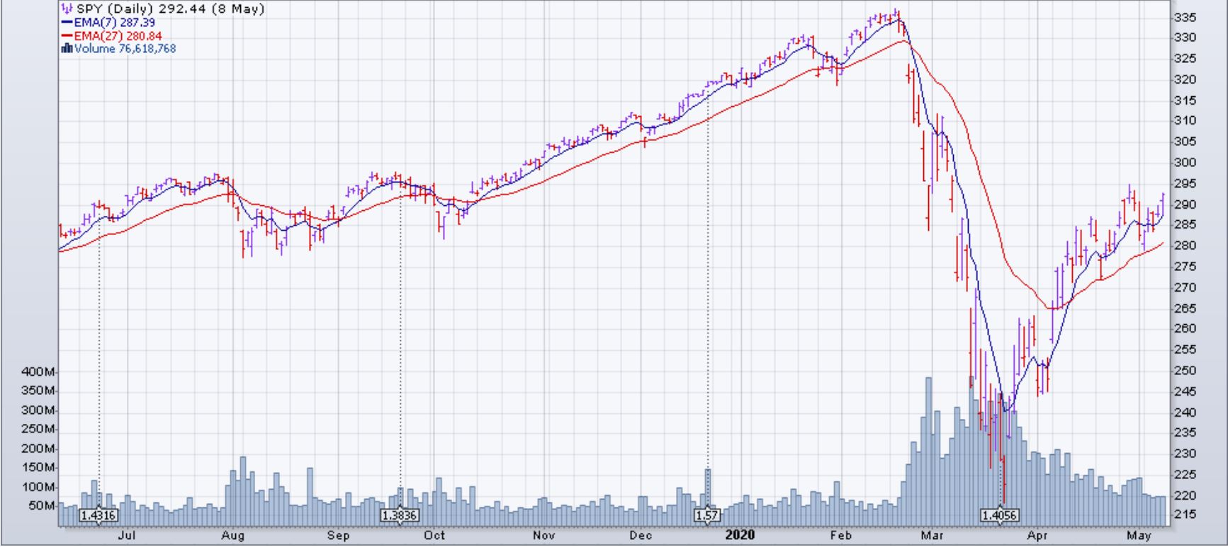 Since the extremely high levels of volatility in the market caused by the Covid-19 pandemic, the margin requirements for ES futures contracts have almost tripled. The week of Aprl 27th we constructed an option strategy on the ES that is profitable if the market slightly rises, slightly falls or stays at the same level. We also bought long-term MES contracts for our clients.