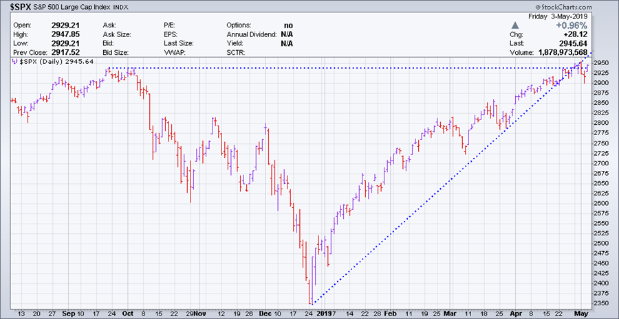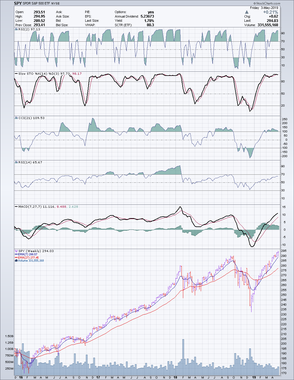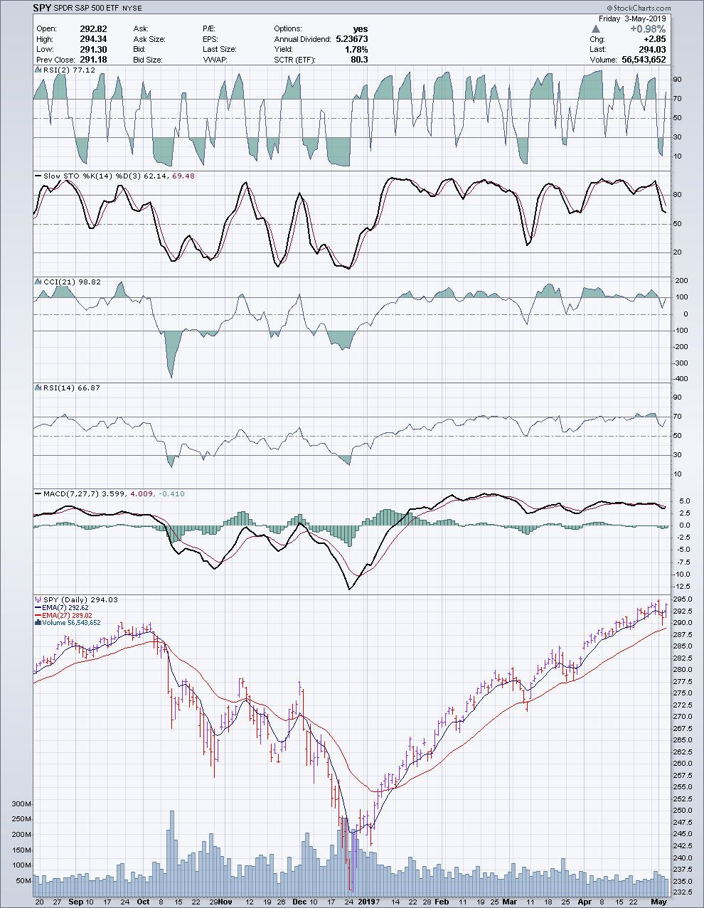 The market (SPY and its derivatives) ended the week at 294.03 points after reaching on Wednesday a historical high. The S&P500 index reached 2,953.99 points (last September the previous highest point was 2,940.91). The week was quite rough. Just after reaching the new high, the market started to fall as the FED said not increasing the interest rate and to be “patient”. On Friday, the April unemployed rate, the lowest in the last decades, boosted the market up. The week ended with a gain 0.002% for the SPY.