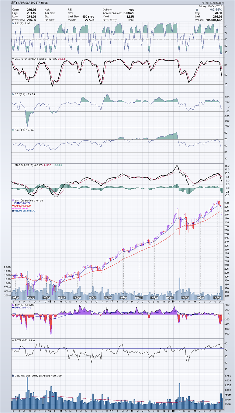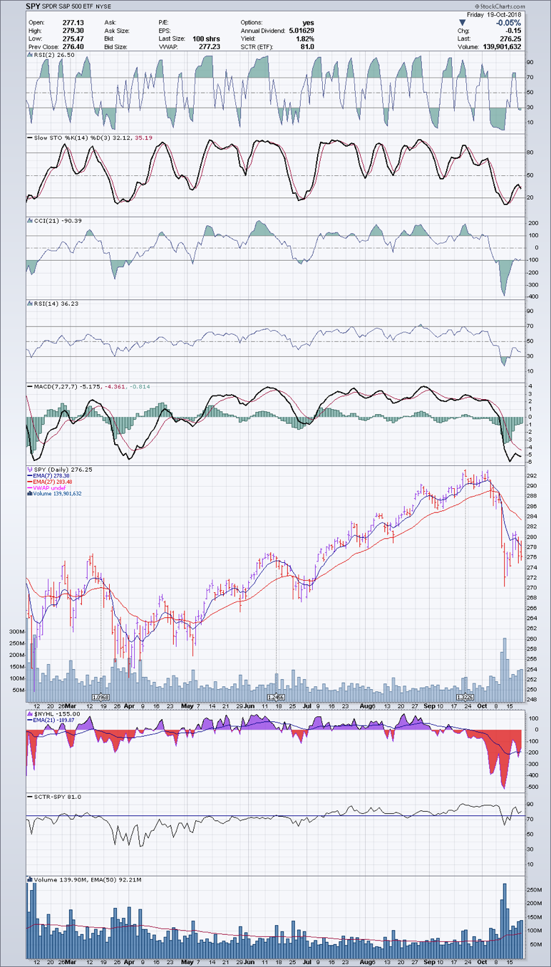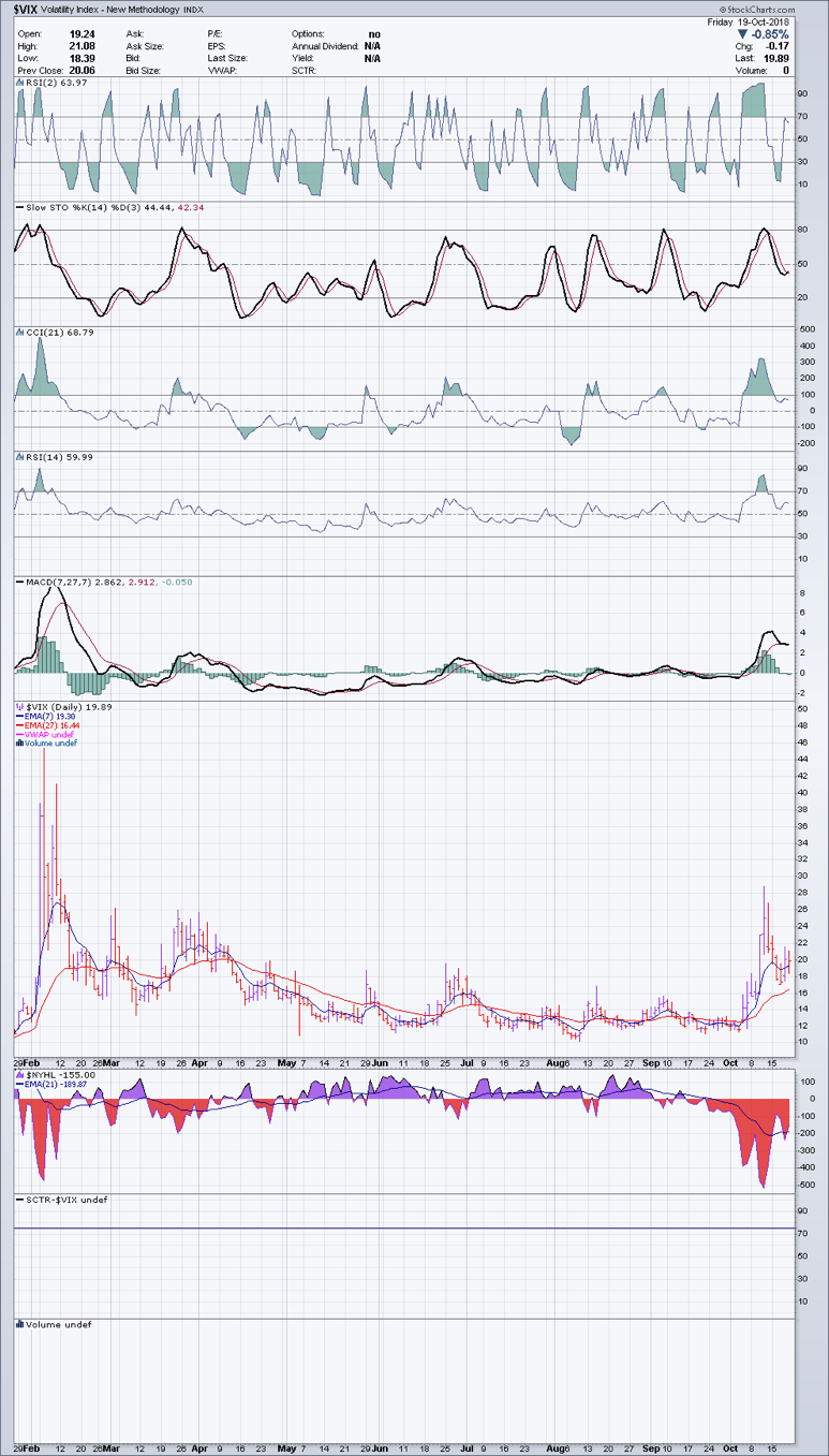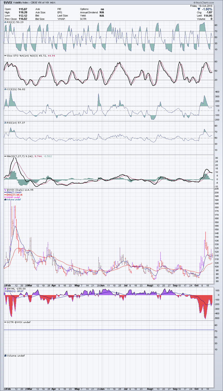 The SPY sailed the forty-third week of 2018 with sustained headwinds and tailwinds that ended with a slight gain. The bearish gap made between October 17 and 18 is partially covered. VIX is at 20%, a level considered unsuitable for technical analysis’ signals. The VVIX (see charts 3 and 4) shows how the VIX itself is volatile: a discouraging signal for short term trading.