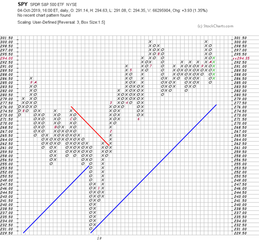 The P&F chart shows a sympathy toward completing a “M” configuration, whose resistance is at 304$ and the support is at 280$. If the SPY goes lower than this price, the down configuration is completed. At the present moment we find unrealistic this probability. We believe the market is fundamentally positive, waiting for a position solution of the commercial dispute between the U.S and the China.
