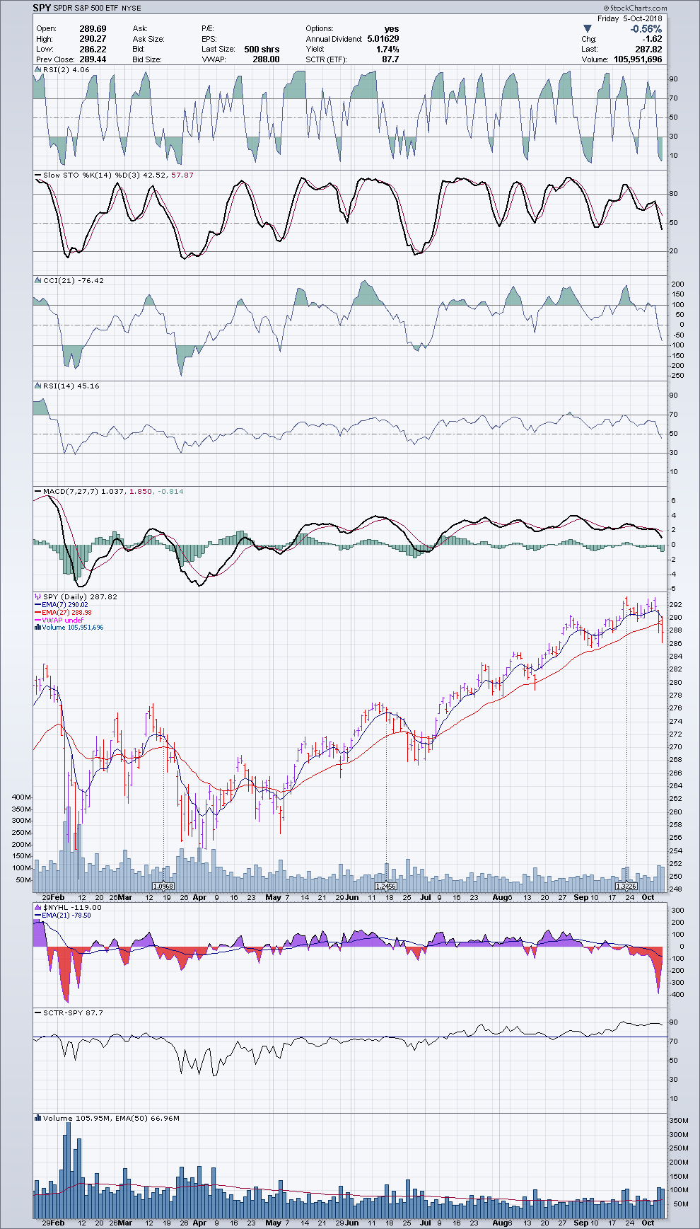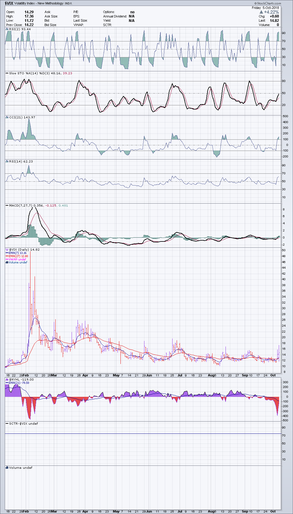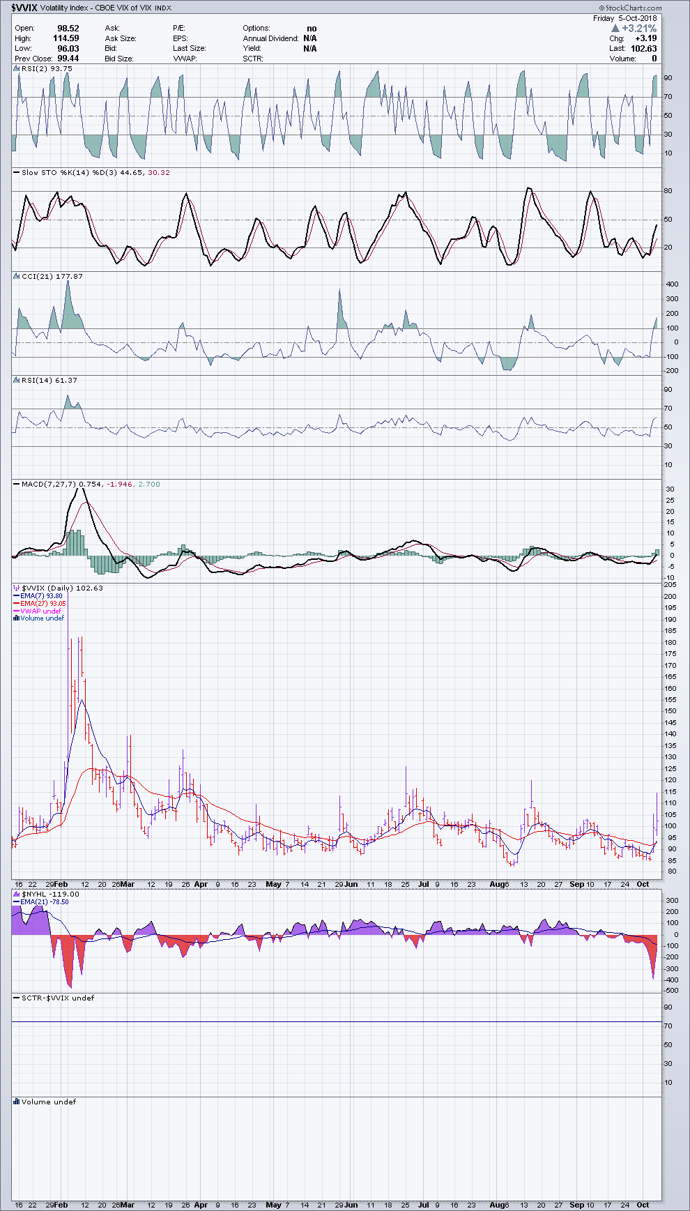 The SPY sailed the forty-first week of 2018 with sustained headwinds that made the SPY decline enough to make the EMA of the VIX and the VVIX (see charts 3 and 4) cross upwards: a discouraging signal for the short term.
