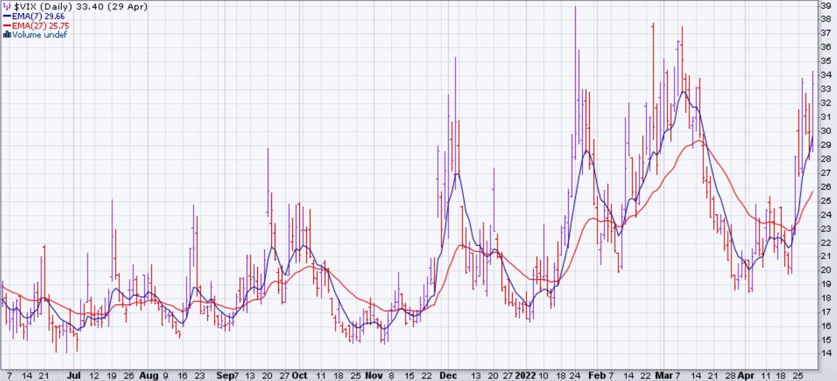 Le VIX a conclu sa semaine à environ 33%: niveau négatif pour le marché. Cependant, les dernières fois que le VIX a atteint ces niveaux il n'a pas été en mesure de monter plus haut.
