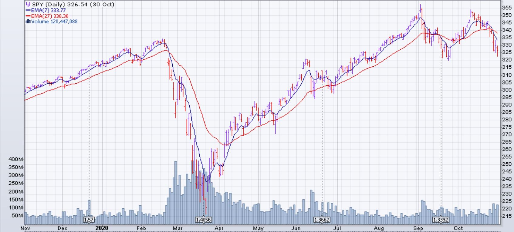 Le marché (SPX et dérivés) est descendu de 5.6% la semaine du 26 octobre 2020. Encore une fois, l'incertitude causée par l'augmentation des cas de Covid-19 à travers le monde affecte négativement le marché. Les investisseurs anticipent des restrictions similaires qu'en printemps aux États-Unis et donc une économie encore une fois au ralenti. En plus, les investisseurs attendent patiemment les résultats des élections. Le secteur de consommation discrétionnaire et le secteur industriel ont eu la pire performance avec des pertes d'environ 6.5%.