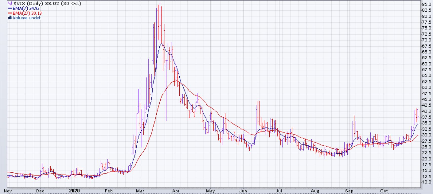 Les EMA du SPY se sont croisés à la baisse durant la semaine. Le marché pourrait être dangereux si le SPY est capable de descendre en bas de 320$. Le VIX a conclu sa semaine à 38%, le plus haut niveau depuis juin 2020.