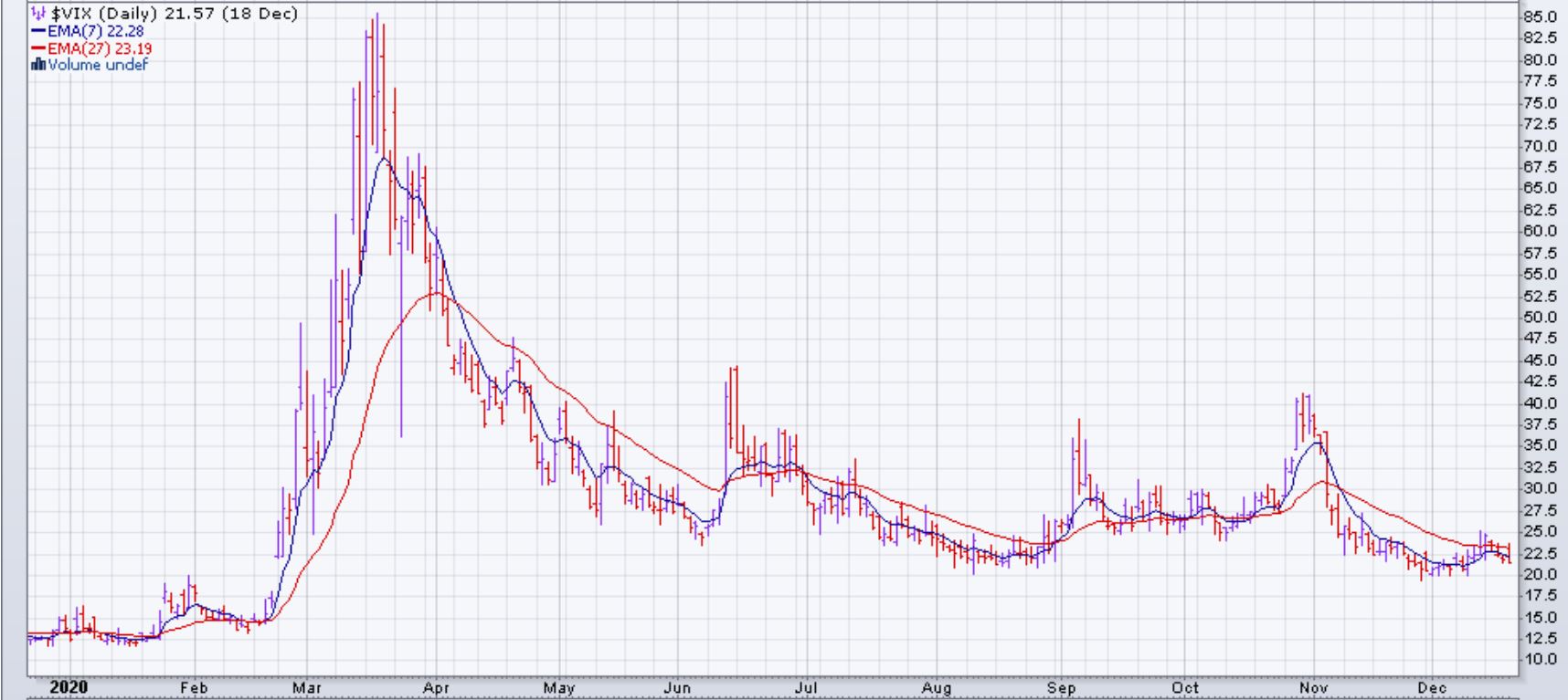 Les EMA du SPY sont toujours croisées à la hausse et jusqu'à présent il n'y a pas de signal de vente dans les indicateurs techniques, par contre la vitesse de la montée du SPY a diminué. Le VIX montre un sympathie vers la hausse parce qu'il devient timide dans sa baisse aux alontours de 20%, cependant les EMA du VIX sont toujours croisées à la baisse (signe positif).