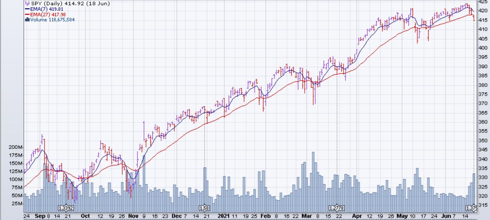 La semaine du 14 juin 2021, nous avons fait une stratégie de ''fence'' sur notre support pour le protéger en cas de baisse. Sur le calendrier M. Powell parlait le mercredi 16 juin et dépendamment de son discours le marché pouvait être dangereux. Pour cela, la ''fence'' protège le support en cas de baisse, mais peut aussi profiter d'un marché neutre ou légèrement à la hausse. Nous avons fermé toutes les positions durant la semaine.