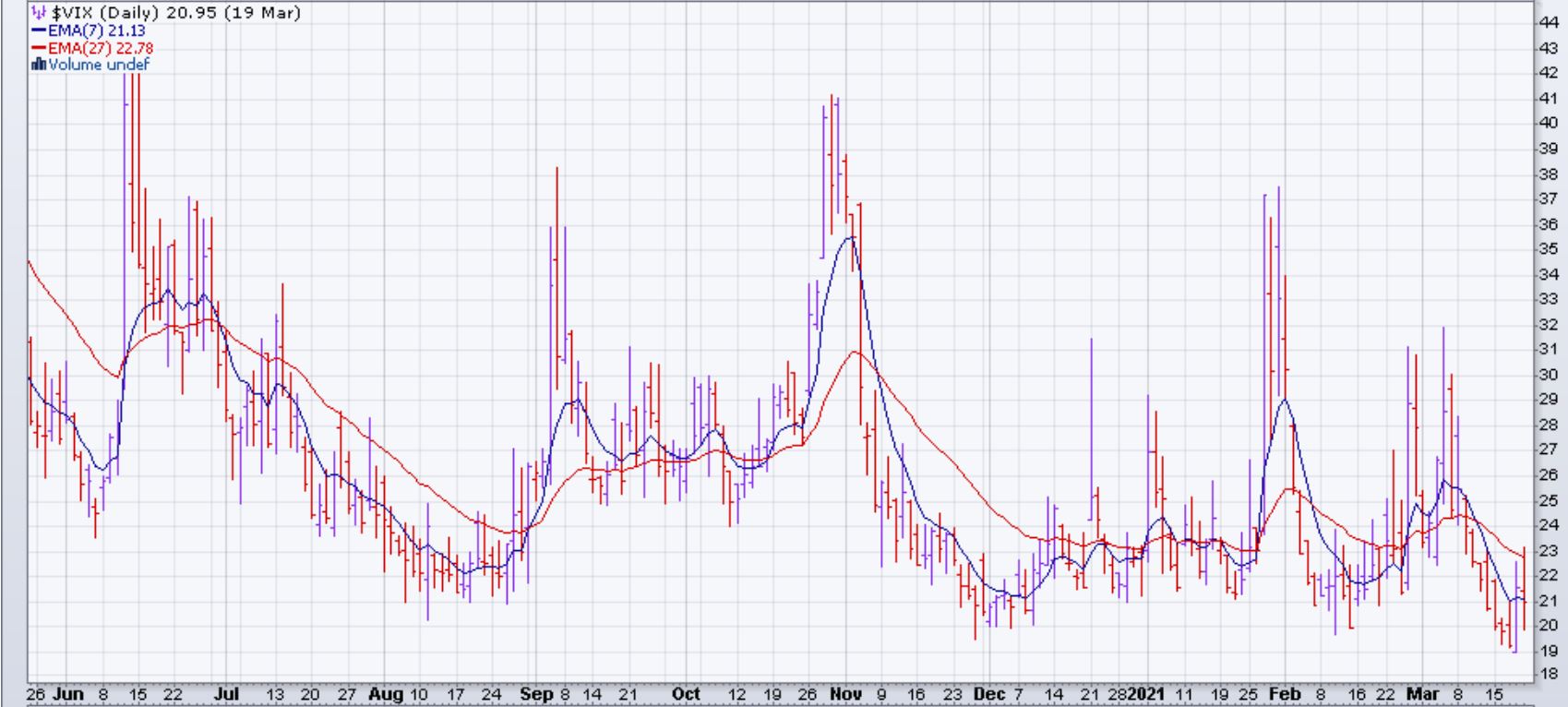 Encore une fois, le VIX remonte lorsque il touche son niveau de support d'environ 20 points. Par contre les EMA 7,27 sont toujours croisées à la baisse: signe positif.