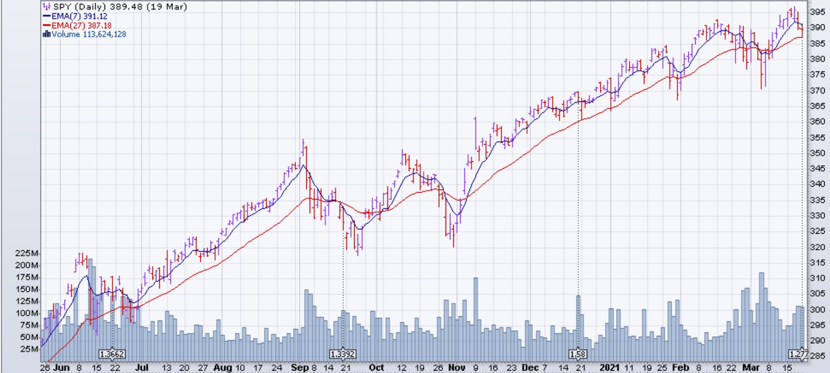 Le marché (SPX et dérivés) est descendu de 0.8% la semaine du 15 mars 2021. Des craintes concernant les rendements des obligations créent du pessimisme dans le marché. En plus, la Réserve fédérale des États-Unis a augmenté ces prévisions d'inflation: signe négatif pour le marché. Seulement trois des secteurs du S&P 500 ont eu un rendement positif. Le meilleur secteur était celui de la consommation discretionnaire avec une montée d'environ 1%. Le secteur de l'énergie a eu la pire performance avec une perte d'environ 7.5%.