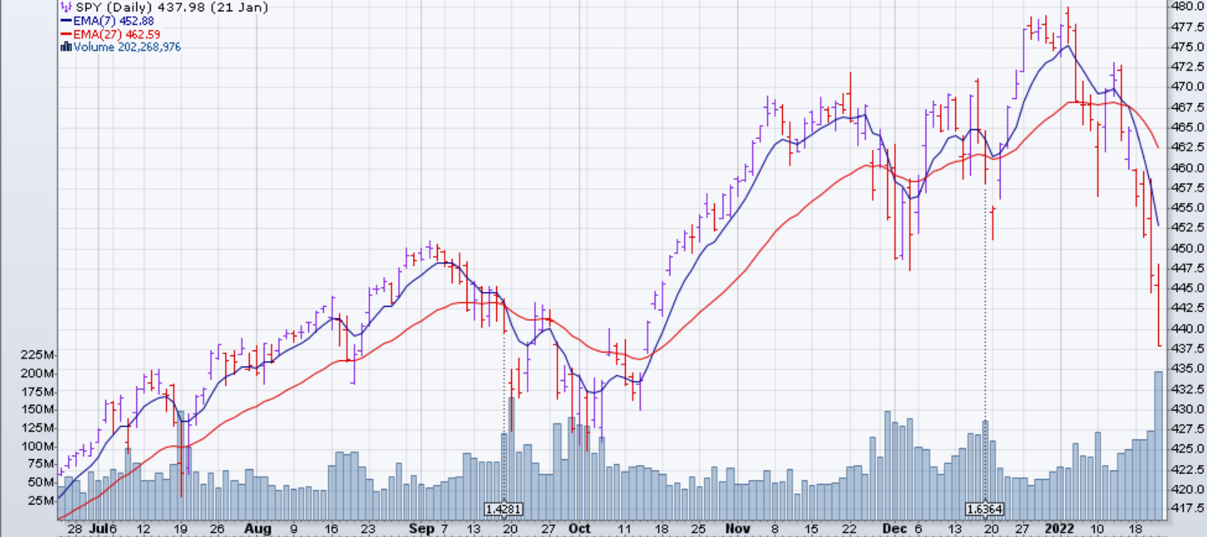 Le SPY a complété une configuration de tête-épaules le 19 janvier 2022: signe négatif pour le marché. Les EMA se sont croisées à la baisse quelques jours avant.