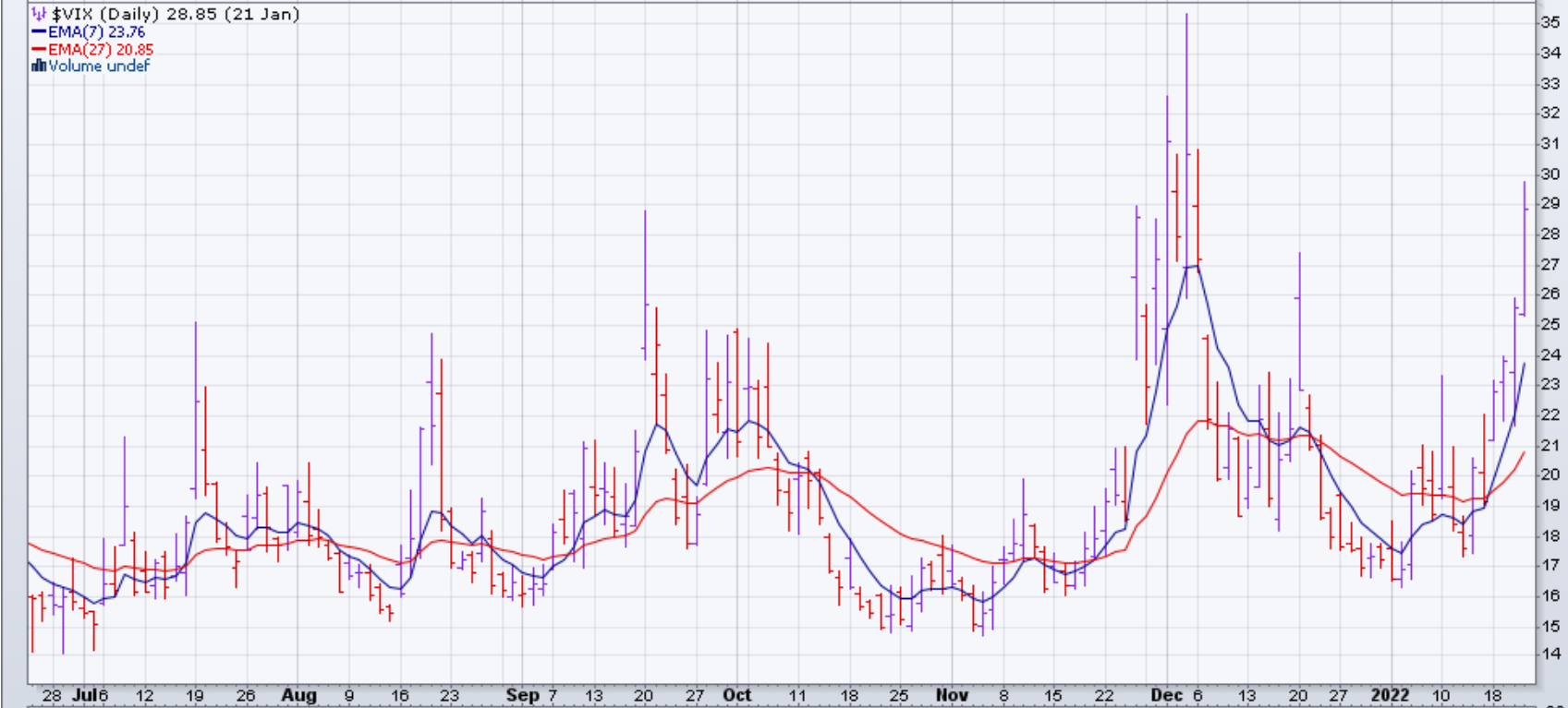 Le VIX a complété une configuration de ''W'' le 19 janvier et ses EMA se sont croisées à la hausse quelques jours avant: signe négatif du marché.