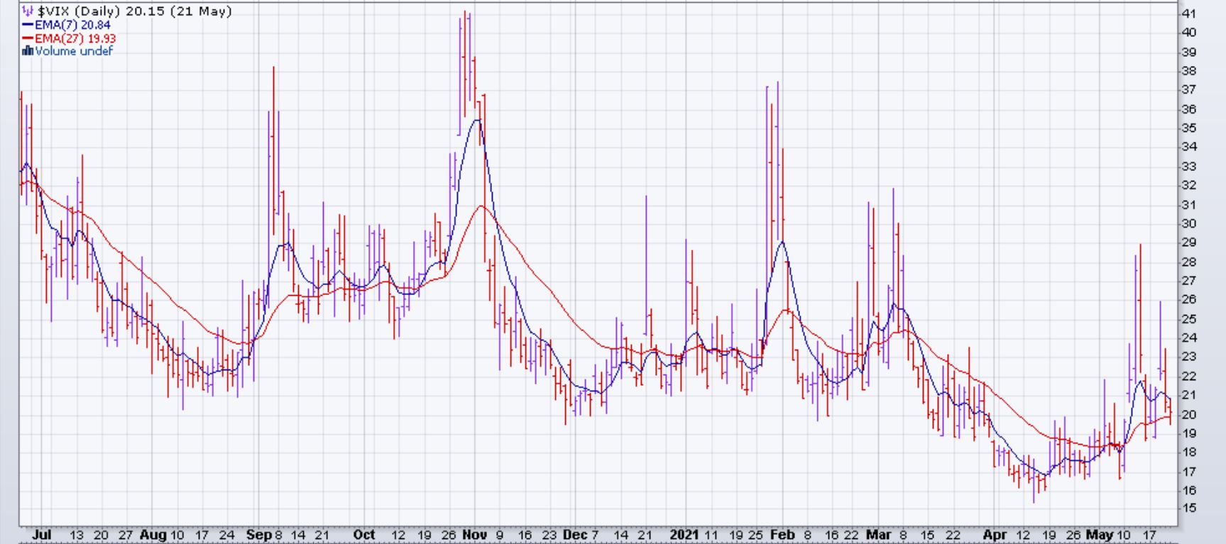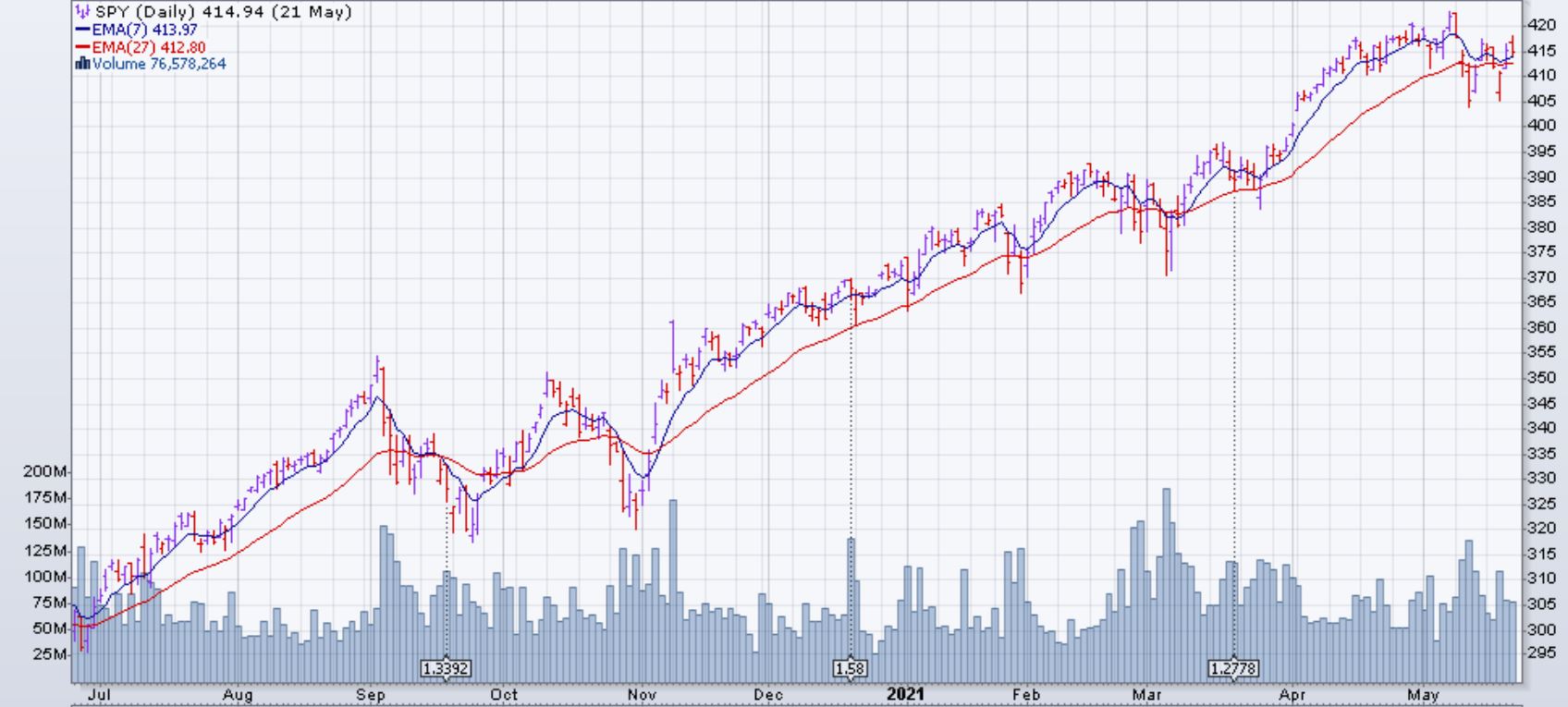 Le marché (SPX et dérivés) a baissé de 0.4% la semaine du 17 mai 2021. Ceci est la première fois cette année que le marché a eu deux semaines de suite avec une baisse. Cinq des onze secteurs du S&P 500 ont eu une performance positive. La pire performance était celle du secteur de l'énergie avec une baisse d'environ 2.5%. Le marché canadien était fermé le lundi 24 mai. Le marché US sera fermé le lundi 31 mai.