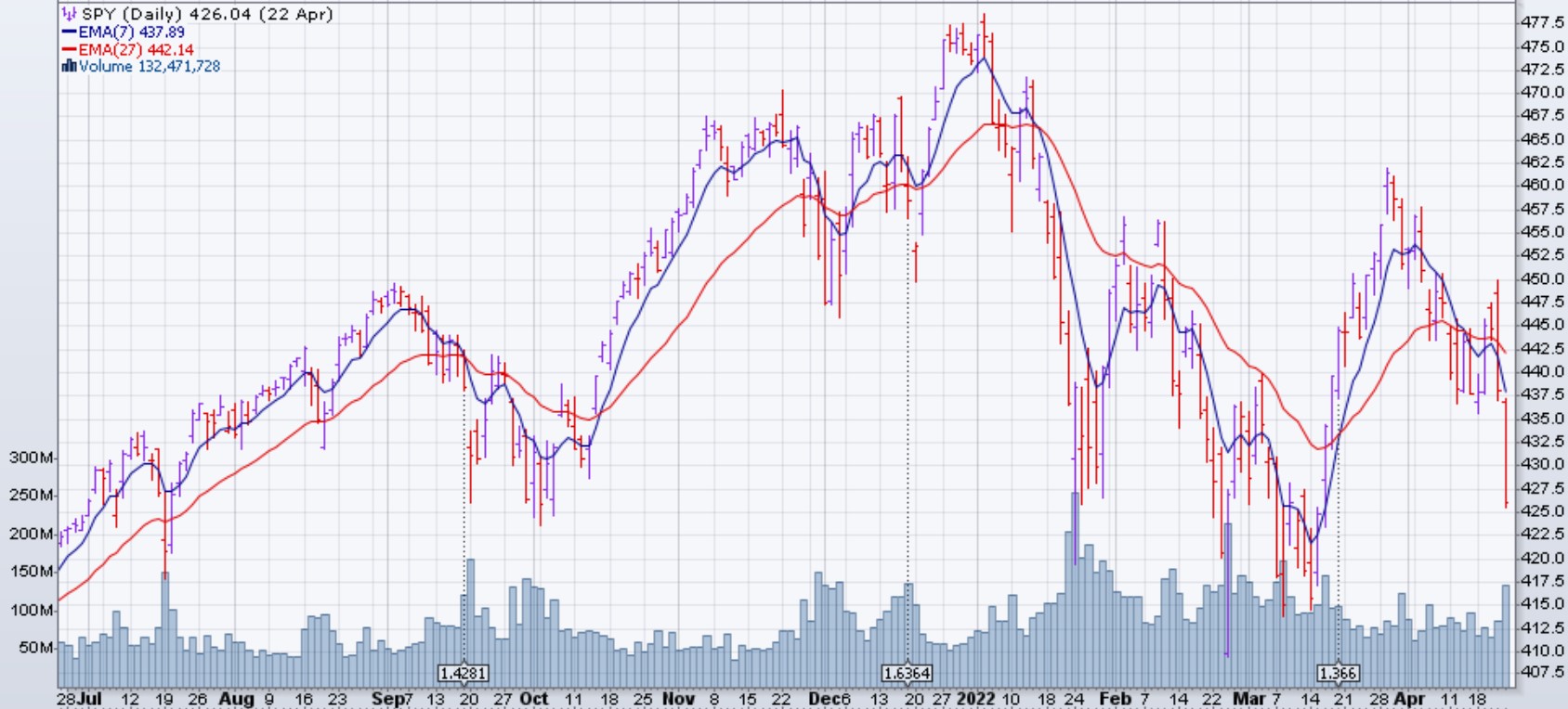Le SPY a complété une configuration de ''M'' vendredi et il a eu la pire correction d'une journée depuis la pandémie en 2020. Il deviens inquiétant si il va plus bas que 410$ (le bas qu'il a fait en février 2022).