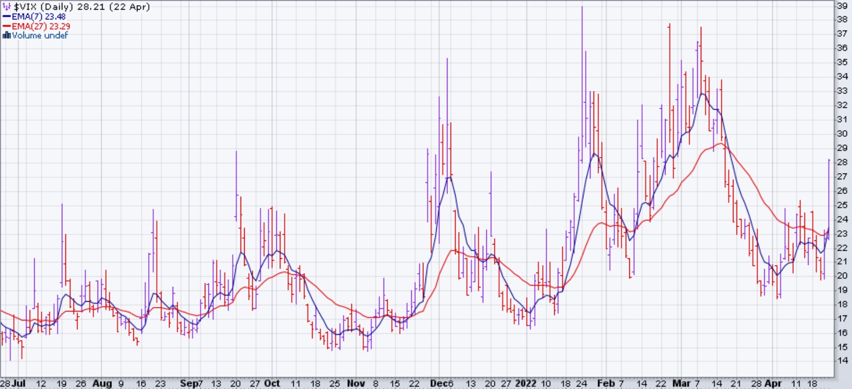 Le VIX, contrairement au SPY, a complété une configuration de ''W'' vendredi et a conclu la semaine a 28%. Ses EMA se sont croisées à la hausse: signe d'une augmentation de volatilité à venir.
