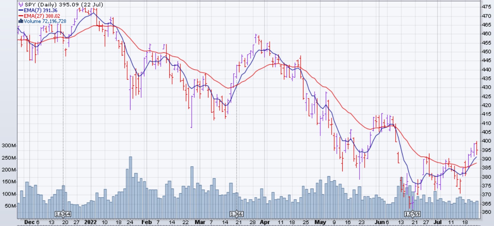 Les EMA du SPY se sont croisées à la hausse: signe positif pour le marché. Par contre, ils se sont croisées aussi à la hausse au début du mois de juin et quelques jours après ils se sont recroisées à la baisse. Ceci du à la volatilité. Cependant, on voit clairement que la vitesse de la baisse a diminué. Vu sur une période de deux mois, le SPY vient de compléter une configuration positive, ce qu'il n'a pas fait au croisement du début de juin.