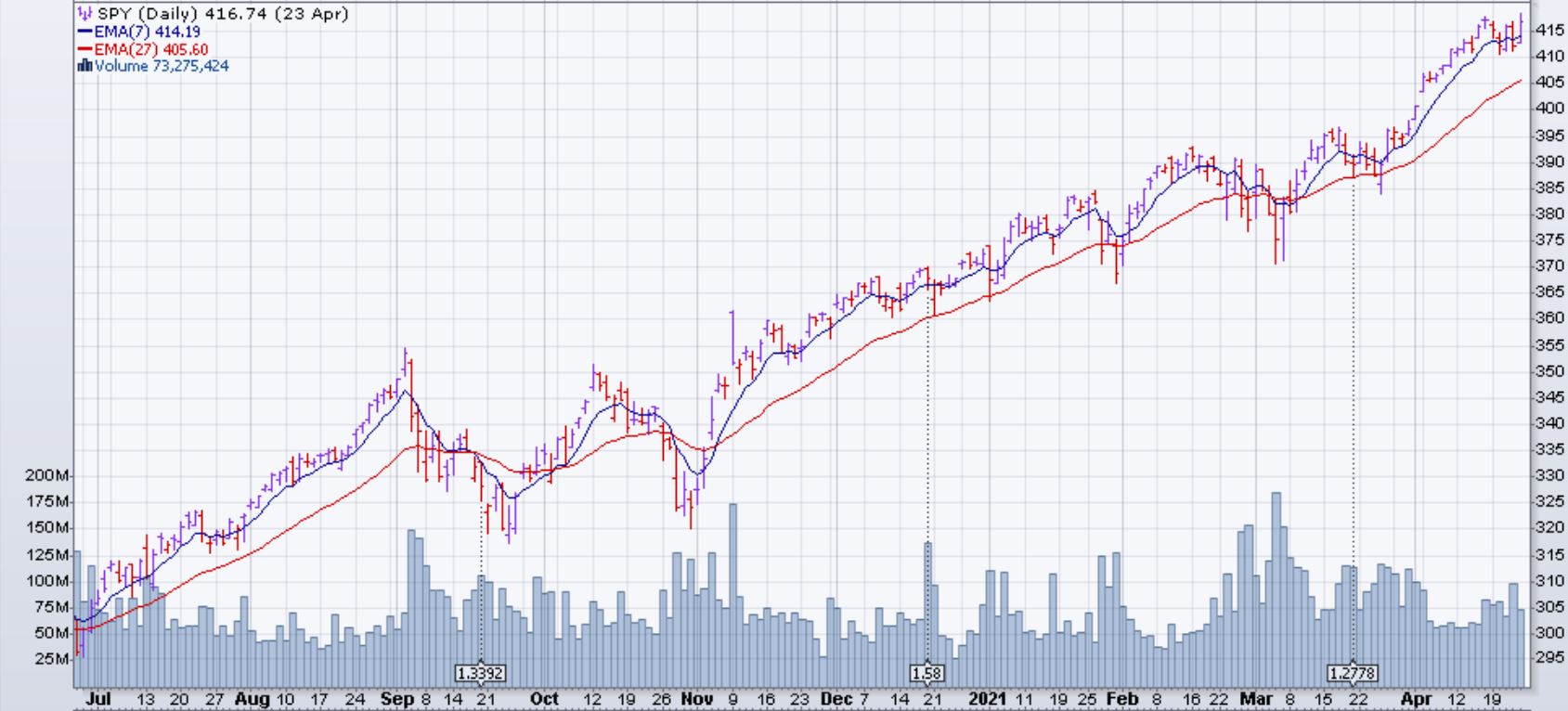 Le SPY a eu une semaine neutre. Il est resté dans une congestion de prix entre 410$ et 418$. Par contre, les EMA sont toujours croisées à la hausse: signe positif.