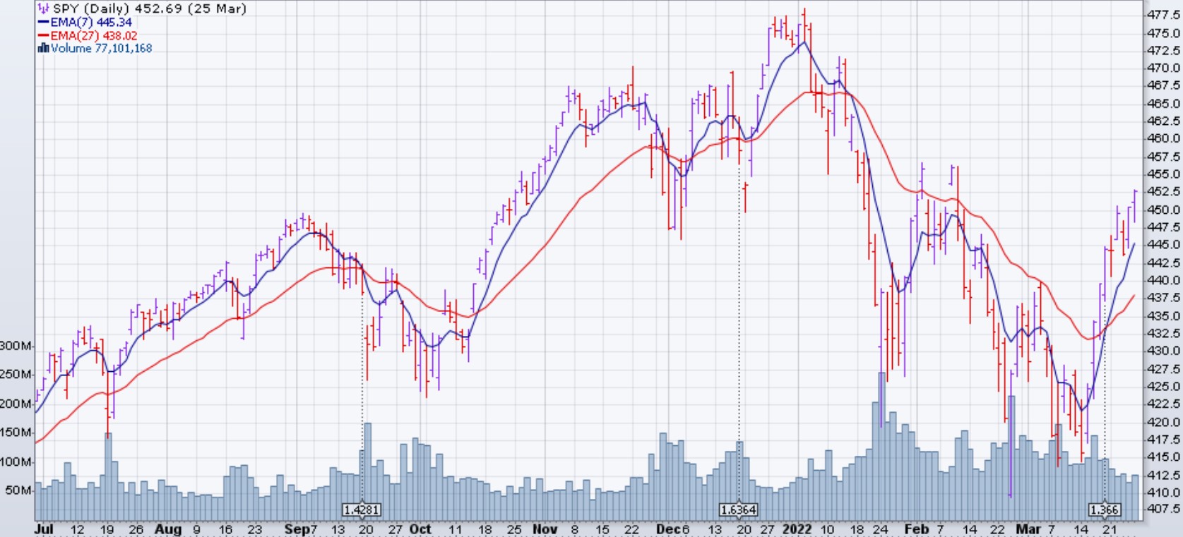 Le marché (SPX et dérivés) est monté de 1.8% la semaine du 21 mars 2022 pour son deuxième gain hebdomadaire consécutif, propulsant l'indice encore plus en territoire positif pour le mois. Les actions ont récupéré une partie de leur perte du début de l'année. Les inquiétudes concernant l'économie et l'inflation ont persisté, d'autant plus que les prix de l'énergie ont grimpé en flèche durant le conflit entre la Russie et l'Ukraine. Néanmoins, les gains des deux dernières semaines laissent espérer que les actions ont suffisamment chuté cette année pour refléter les incertitudes économiques et géopolitiques. Les investisseurs espèrent que les données macroéconomiques du premier trimestre 2022 et les résultats des entreprises se révéleront meilleurs que prévu.