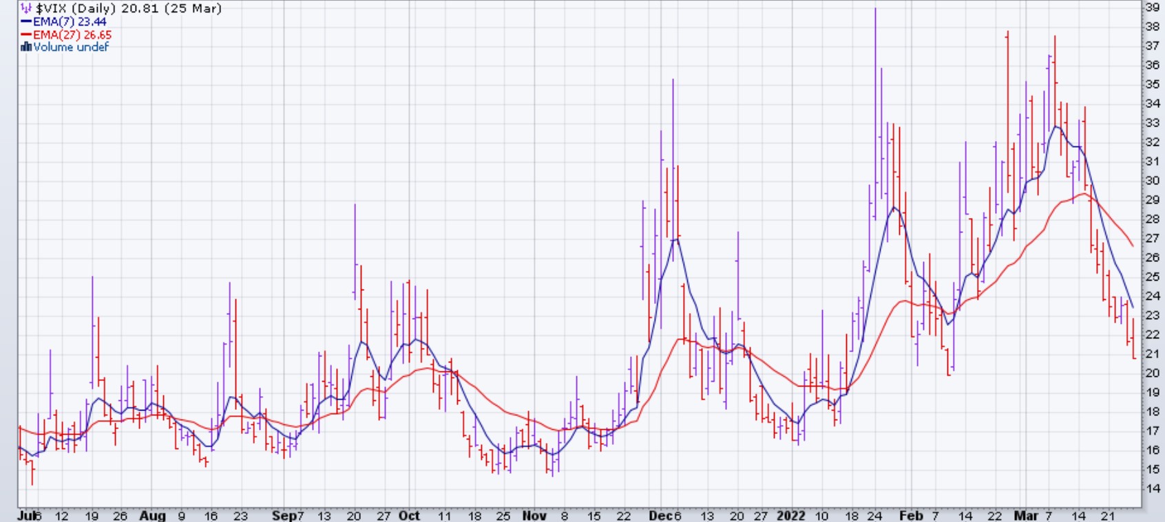 Le VIX a fini la semaine a environ 21%: un niveau encore haut, par contre ses EMA se sont croisés à la baisse.
