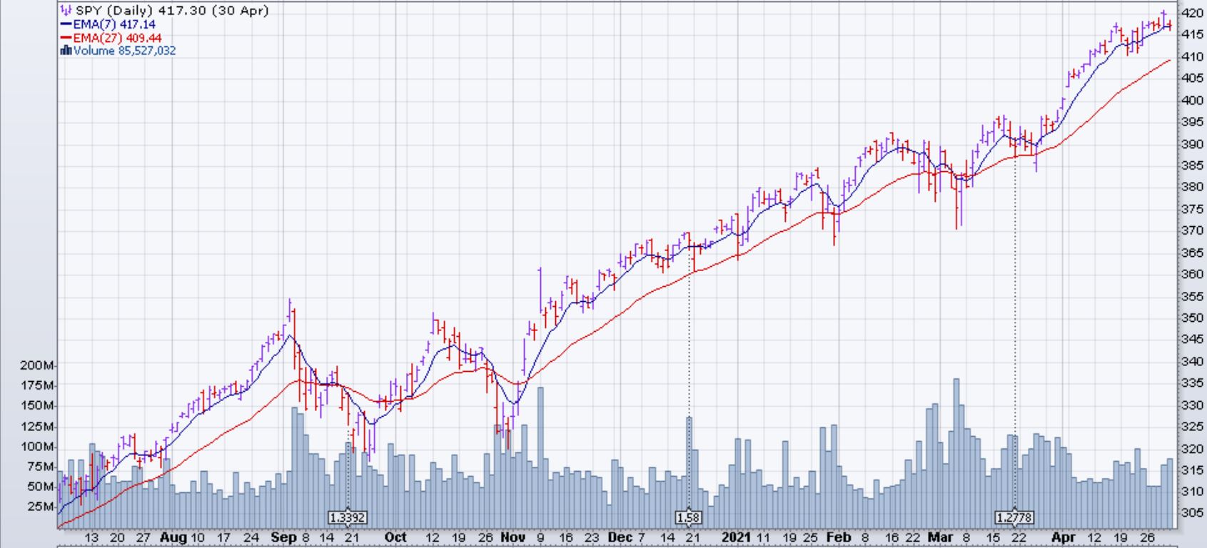 Le marché (SPX et dérivés) a atteint un haut historique la semaine du 26 avril 2021. Le message positif de la Réserve fédérale, les résultats des bénéfices pour le premier trimestre 2021 des compagnies ''mega-caps'' et les résultats positifs sur l'économie en générale ont poussé le marché a un haut historique. Le secteur de l'énergie a eu la meilleure performance avec une montée d'environ 4%. Le secteur de la santé et celle de la technologie ont eu la pire performance avec des pertes d'environ 2%.