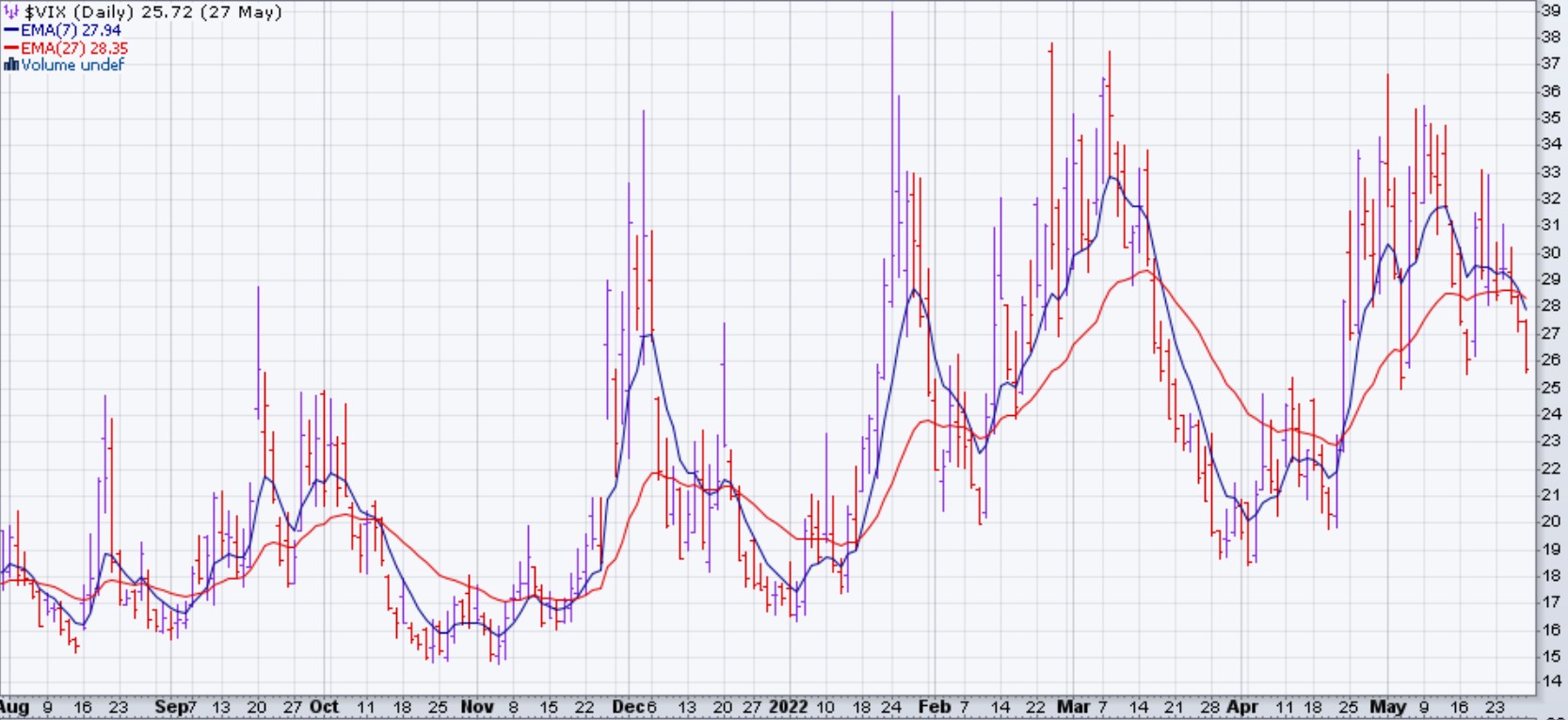 Le VIX a conclu sa semaine à 25%, un niveau encore très haut, par contre ses EMA se sont croisées à la baisse vendredi le 27 mai. Si le VIX est capable de descendre plus bas que 25% (un support depuis la fin d'avril), il aura une sympathie vers une baisse de volatilité du marché et donc un symptome positif pour les marchés.