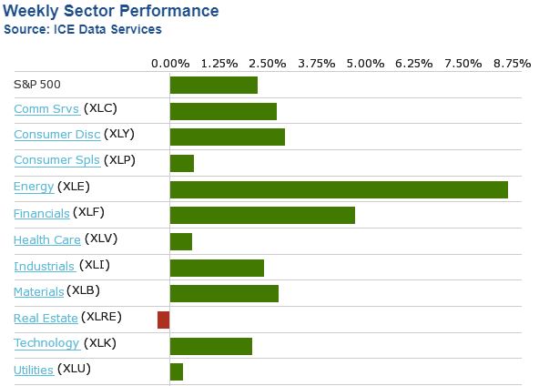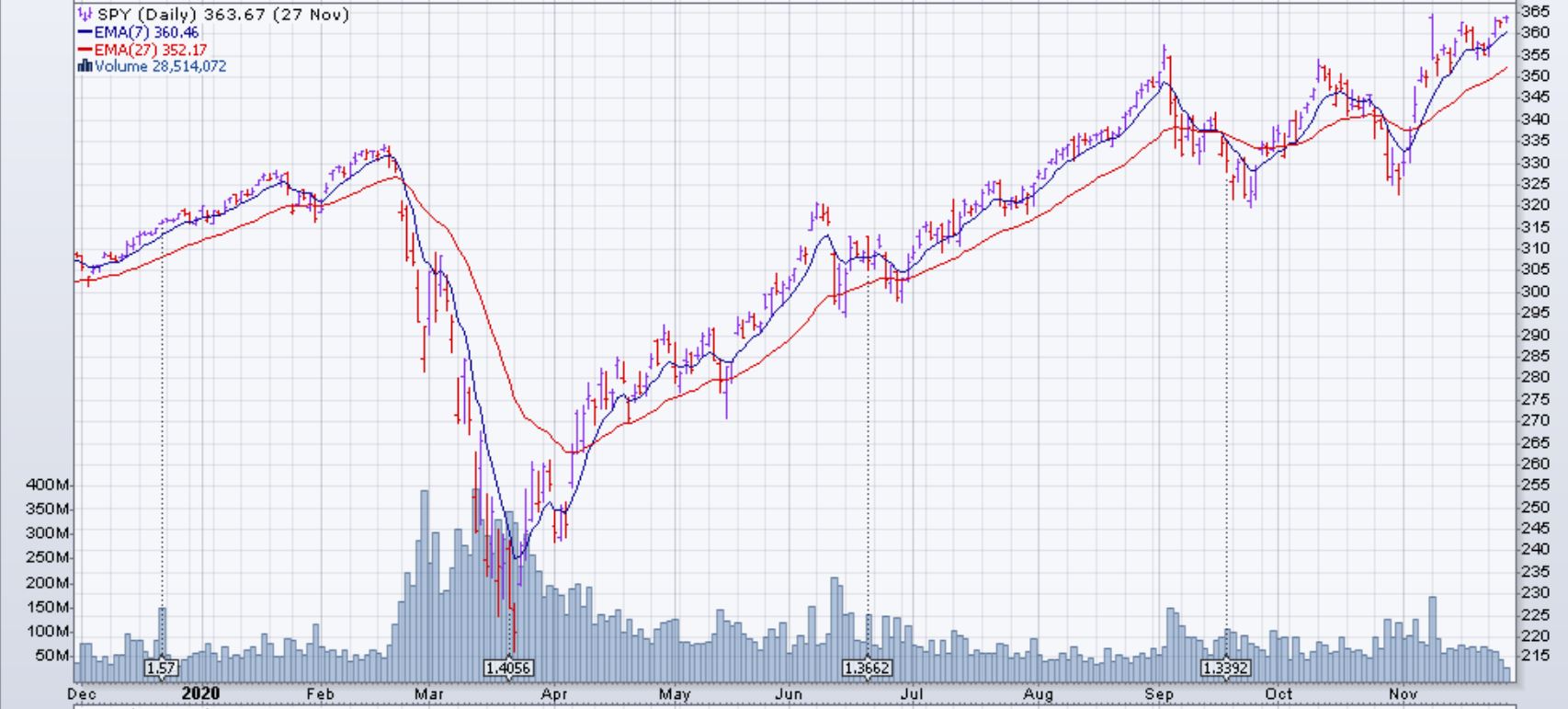 Le marché (SPX et dérivés) est monté de 2.3% la semaine du 23 novembre 2020. L'optimisme sur le progrès des vaccins de Covid-19 et la transition du président américain ont favorisé un marché haussier. Le marché US était fermé toute la journée jeudi le 26 novembre et une demi-journée vendredi pour l'Action de Grâce américaine. Tous les secteurs du SPY ont eu des rendements positifs sauf celui de l'immobilier. Le meilleur secteur cette semaine était celui de l'énergie avec une montée de 8.75%.