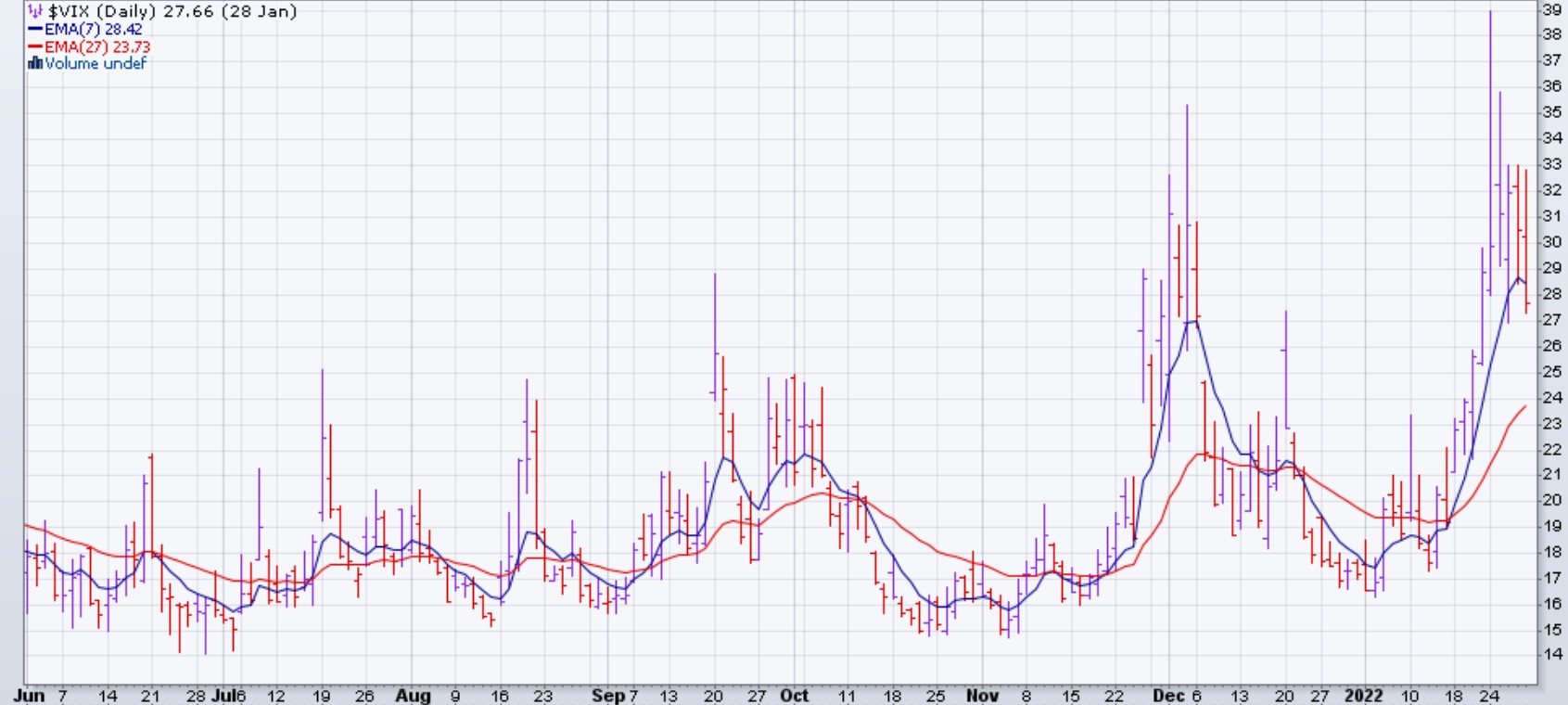 Le VIX a terminé la semaine à environ 28% : un niveau encore problématique. Par contre la distance entre ses EMA diminue: un signe positif.