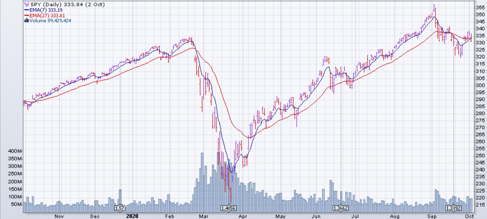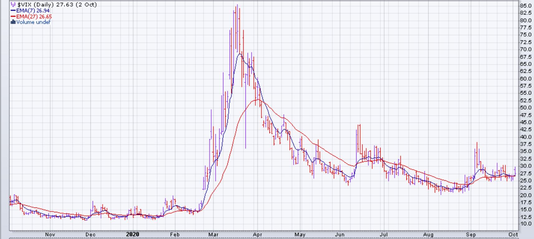 Le SPY semble vouloir remonter. Ses EMA se rapprochent pour eventuellement se recroiser à la hausse. Par contre, chaque fois qu'il y a une journée positive, elle est suivie d'une journée plus timidement à la hausse ou même négative: ce qui montre une fragilité dans sa hausse. Le VIX montrait de la sympathie vers la baisse avant que la nouvelle que M. Trump a attrapé le virus. Ceci a fait monter le VIX. Techniquement parlanrt, le VIX pourrait tomber (effet poitif pour le marché) s’il est capable de descendre plus bas que 25 parce qu'il a un support significatif à ce niveau.