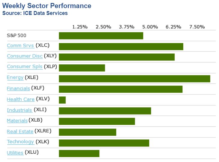 Le marché (SPX et dérivés) est allé à la hausse de 4.65% la semaine du 1er février 2021 en atteignant un nouveau haut historique. Cette montée est due principalement aux bonnes nouvelles sur un nouveau vaccin, la création de 49,000 emplois aux États-Unis en janvier et la troisième semaine de suite de baisse de cas d'hospitalisation pour le Covid-19. Un grand nombre d'investisseurs croient que les pires moments de cette pandémie sont derrière nous. Pour la première fois depuis plusieurs semaines, tous les 11 secteurs du S&P 500 ont été à la hausse . Le meilleur secteur de la semaine a été celui de l'énergie avec une hausse d'environ 8%.
