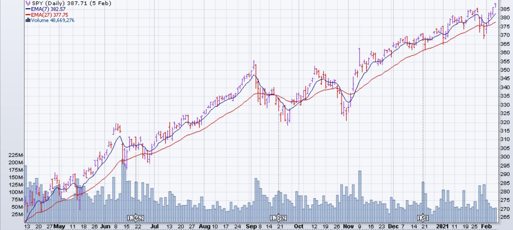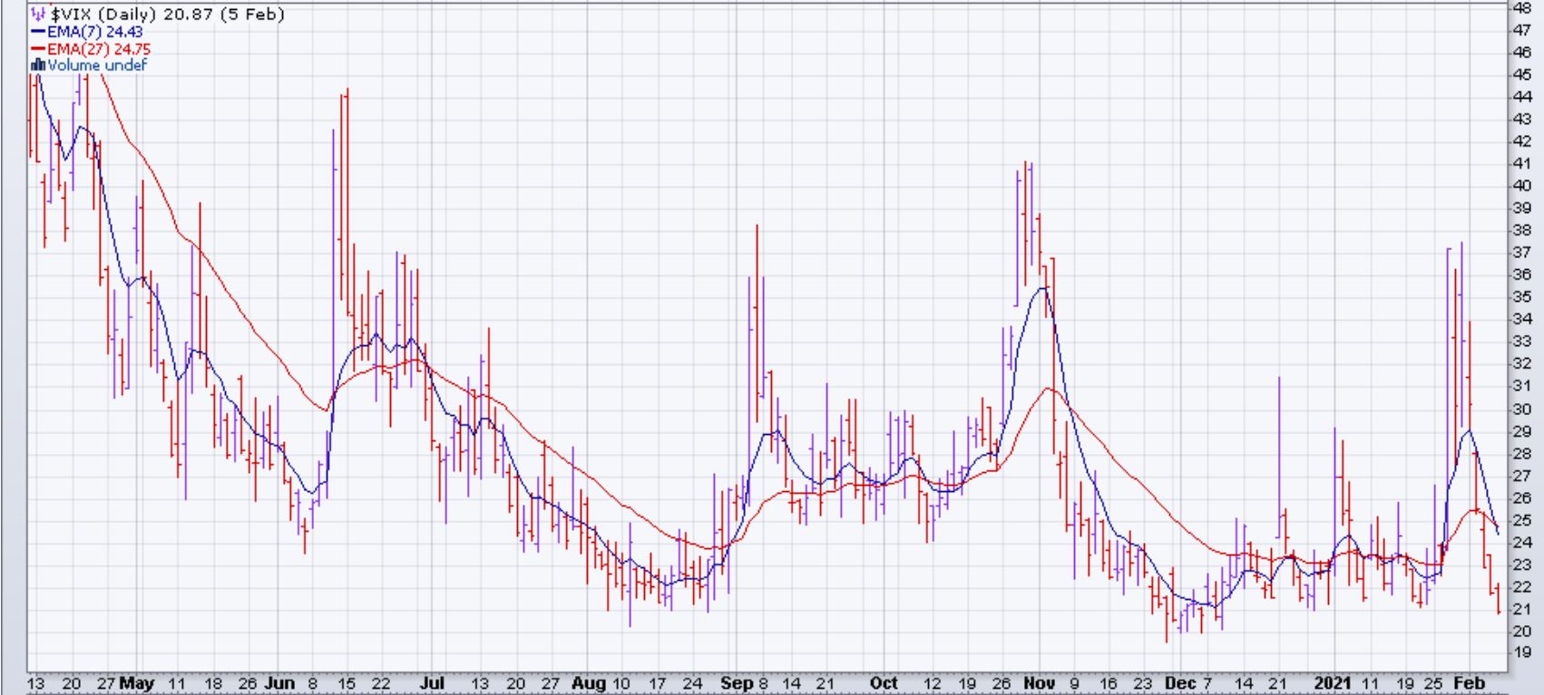 Le SPY continue sa tendance haussière après avoir subi une contre-vague du 26 janvier au 5 février et a atteint un nouveau haut historique. Les EMA sont toujours croisées à la hausse et la distance entre la EMA(7) et la EMA(27) augmente: un signe positif pour le marché. Les indicateurs techniques du SPY sont plutôt neutres et montrent une certaine fatigue à la hausse sans donner un signal de vente. Les EMA du VIX se sont croisés à la baisse à la fermeture de vendredi le 5 février: signe positif pour le marché. Cependant, le VIX est toujours incapable de baisser plus bas que 20 points: un support depuis le mois d'août 2020.
