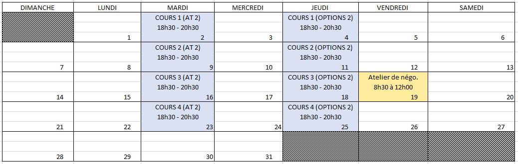 En partenariat avec Desjardins Courtage en ligne, nous offrons des webinaires, des séries de quatre cours, des cours intensifs en fin de semaine et des ateliers de négociation active. Pour voir le calendrier de ces événements, suivez le lien suivant :