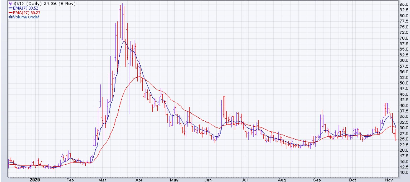 Les EMA du SPY se sont croisées à la hausse durant la semaine et le SPY a terminé à un niveau très similaire a celui du haut de septembre et d'octobre derniers. Depuis deux mois, le SPY fluctue dans une grande congestion entre 320$ et 360$. Le VIX a conclu la semaine à 25%, un niveau encore élevé. Parcontre, les EMA du VIX semblent favorables pour un croisement à la baisse: un signe positif pour le marché.