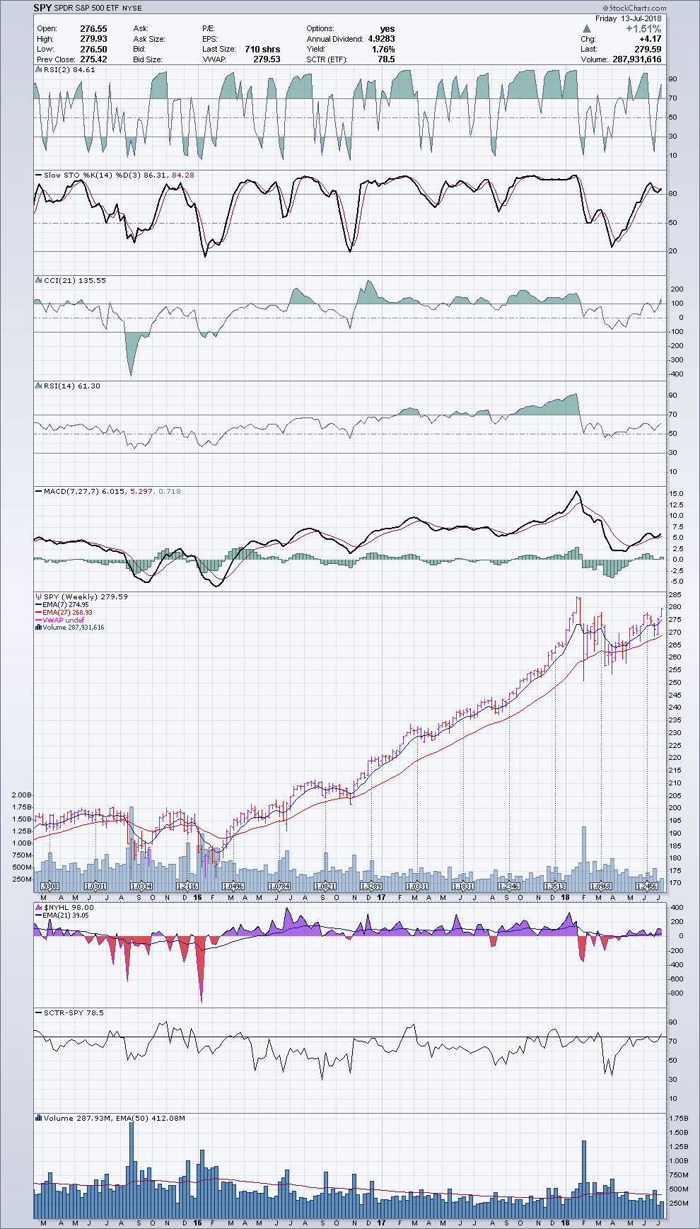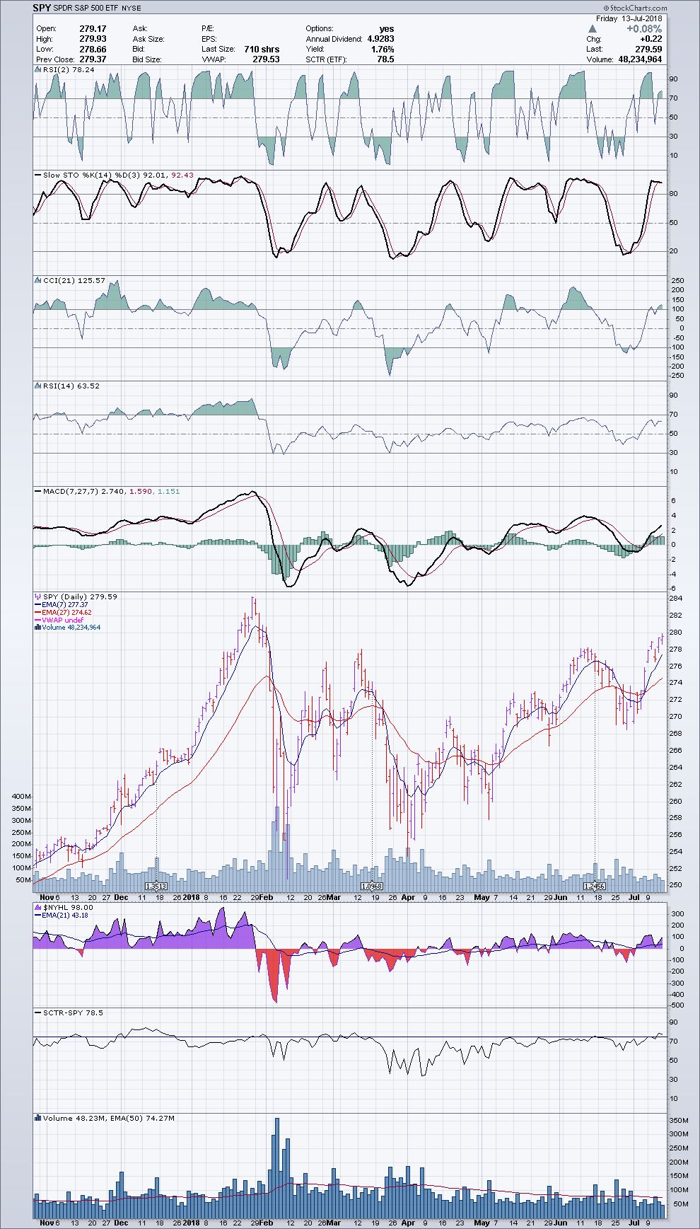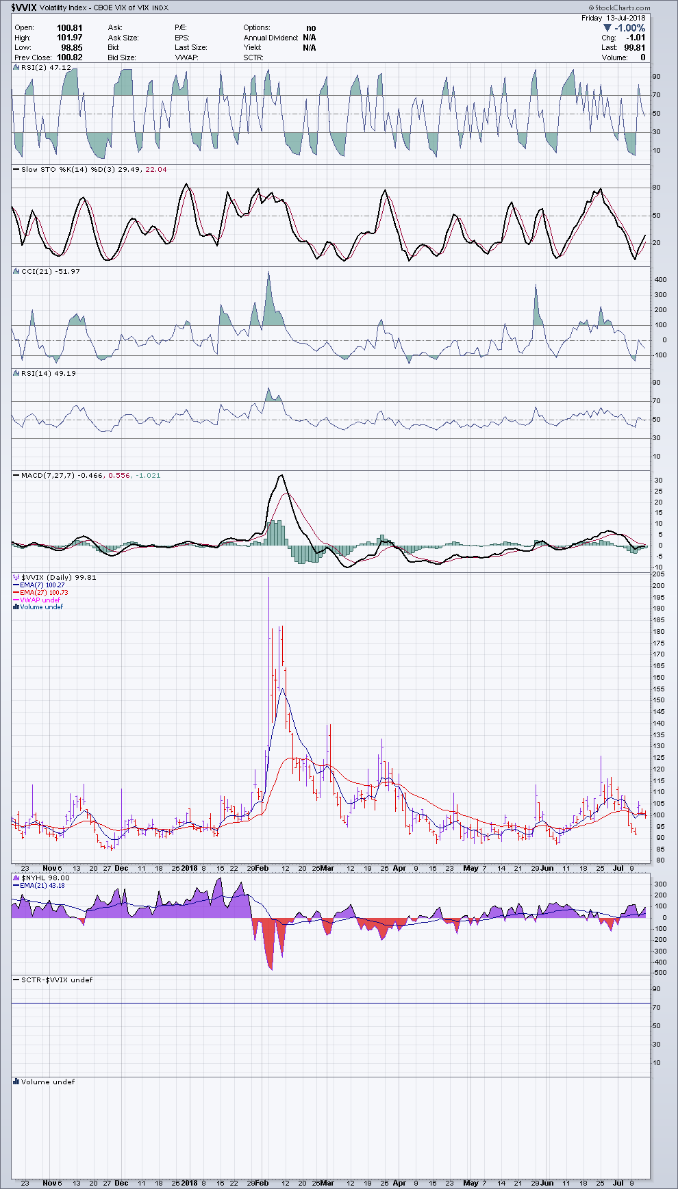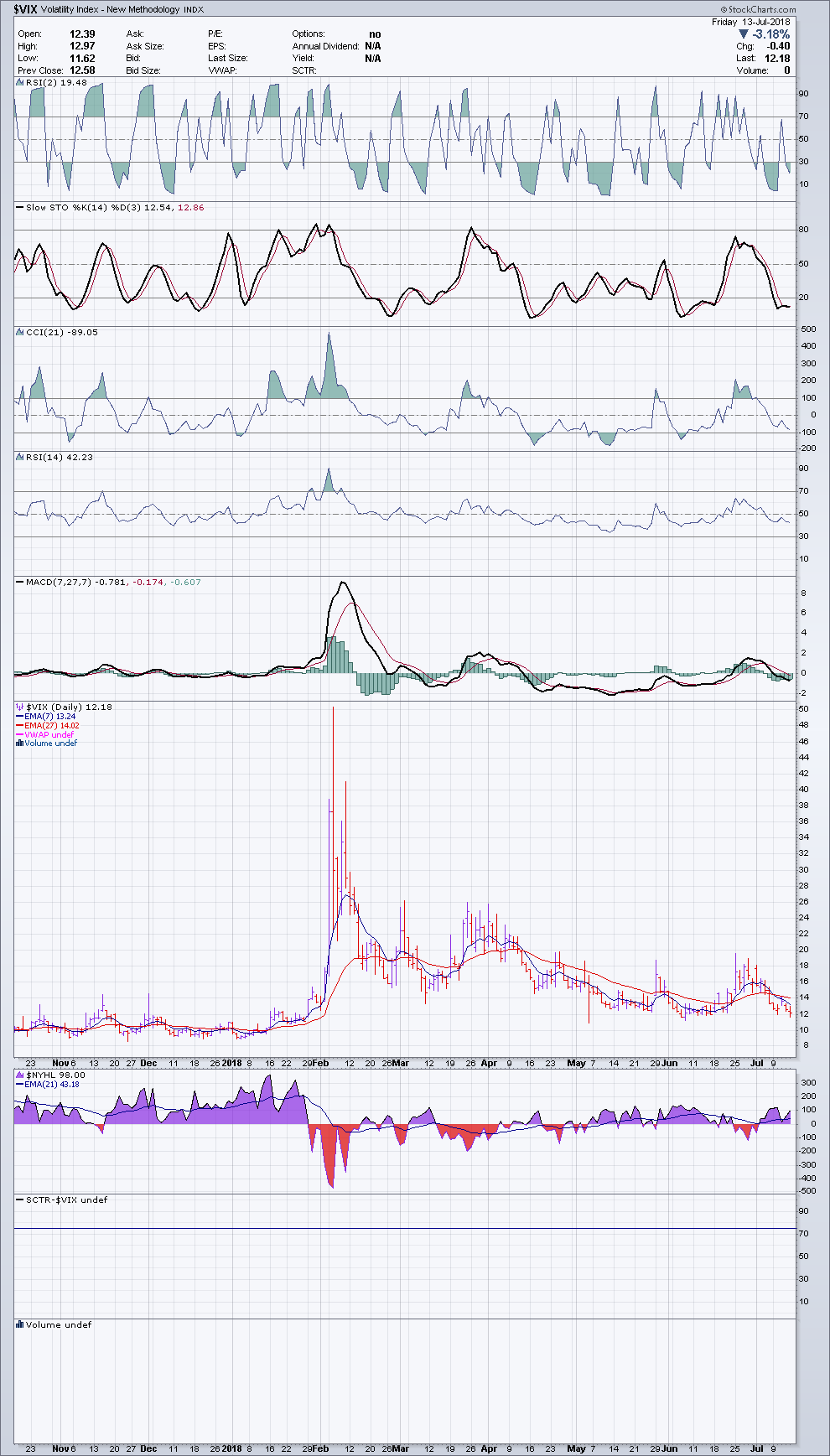 Le SPY a navigué la vingt-huitième semaine de 2018 avec des forts vents de poupe qui ont porté le SPY au niveau de 279.59 : le plus élevé depuis quatre mois. Mais depuis la fin de janvier, le SPY navigue une ample congestion à vocation haussière. Le VIX est positivement bas (Graphique 3 - le VIX va à l’envers du SPY). Le VVIX (volatilité du VIX – voir graphique 4) montre que l’ampleur des fluctuations du VIX est stable : ce qui en soi est un signe positif. La toile de fond du marché (la EMA7,27 – hebdo- graphique 2) est à la hausse. Le SPY avait atteint un sommet historique à 285,49 points le 26 janvier 2018. Conclusion sur cette semaine: le ciel bleu est de retour. Actuellement nos comptes restent orientés dans des FNB et BNB à haut rendement (entre 5 et 10% sur base annuelle) parce que ces produits actuellement sont en hausse de prix comme le reste du marché, générant une plus-value qui s’additionne aux rendements en dividendes. Dans les comptes en USD on continue de garder prudemment une partie de la liquidité dans FLOT, MINT, NEAR; mais aussi pour réduire la volatilité globale du portefeuille. Dans les comptes en dollars canadiens c’est le PSA ou similaires. En résumé, nos portefeuilles sont constitués en moyenne à 60% en FNB à revenu et le reste en FNB directif, avec une propension à un rééquilibrage à 50%. On augmente, où possible, le capital synthétiquement avec des stratégies d’options à cout pratiquement zéro. La gestion de portefeuille est toujours ad hoc pour chaque client. Mais on offre en plus, aux clients intéressés, des mini portefeuilles standardisés sur cinq approches spécifiques, basées, comme les portefeuilles en gestion ad hoc, sur des FNB : (Les frais de gestion par Charles K. Langford Inc. sont de 0,9 % du capital, par année (équivalent à $900 pour 100,000$). Le capital sous gestion est investi exclusivement en ETF, ETN et options). Parmi un groupe de titres, la semaine qui vient de se terminer a donné vendredi des signaux techniques d'achat à moyen terme et long terme pour les titres canadiens suivants. Signaux techniques de TENDANCE À la hausse à moyen terme À la hausse à long terme Marché canadien CCL/B.TO ARX.TO L’investisseur qui pense que le marché canadien actuel offre des occasions intéressantes à la hausse peut acheter des options call sur ARX, actuellement, vendredi, à 12.94$. Il peut en profiter avec le call 17 aout /12.00 à 2.96$ dont le delta est 0.98 avec un gamma de 0.03 (accélérateur du delta). Le profit sur le call devient 98% de celui de la hausse du titre à un prix qui est environ cinq fois inférieur au prix actuel du titre. Si le titre baisse, la perte maximale est la prime. SPY - Jour - 2018/07/13 SPY - Hebdo - 2018/07/13 VIX - Jour - 2018/07/13 VVIX - Jour - 2018/07/13