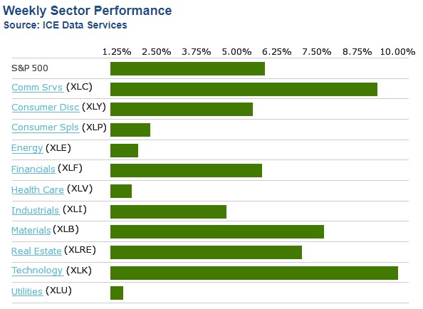 Tous les secteurs du S&P 500 ont progressé cette semaine. Le secteur de la technologie a enregistré la plus forte augmentation en pourcentage, en hausse de 10 %, suivi d'une hausse de 9,2 % dans les services de communication et d'une hausse de 7,7 % dans les matériaux. L'immobilier a également été solide, en hausse de 7,1 %, suivi par des augmentations de 5,9 % et de 5,7 % dans la consommation discrétionnaire et les services financiers, respectivement.