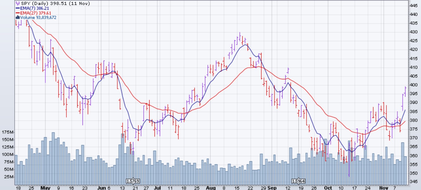 Le SPY a complété une configuration de tête-épaule à la hausse jeudi le 10 novembre: signe positif pour le marché. Par contre, il y a un immense ''gap'' de 10 points à la baisse.