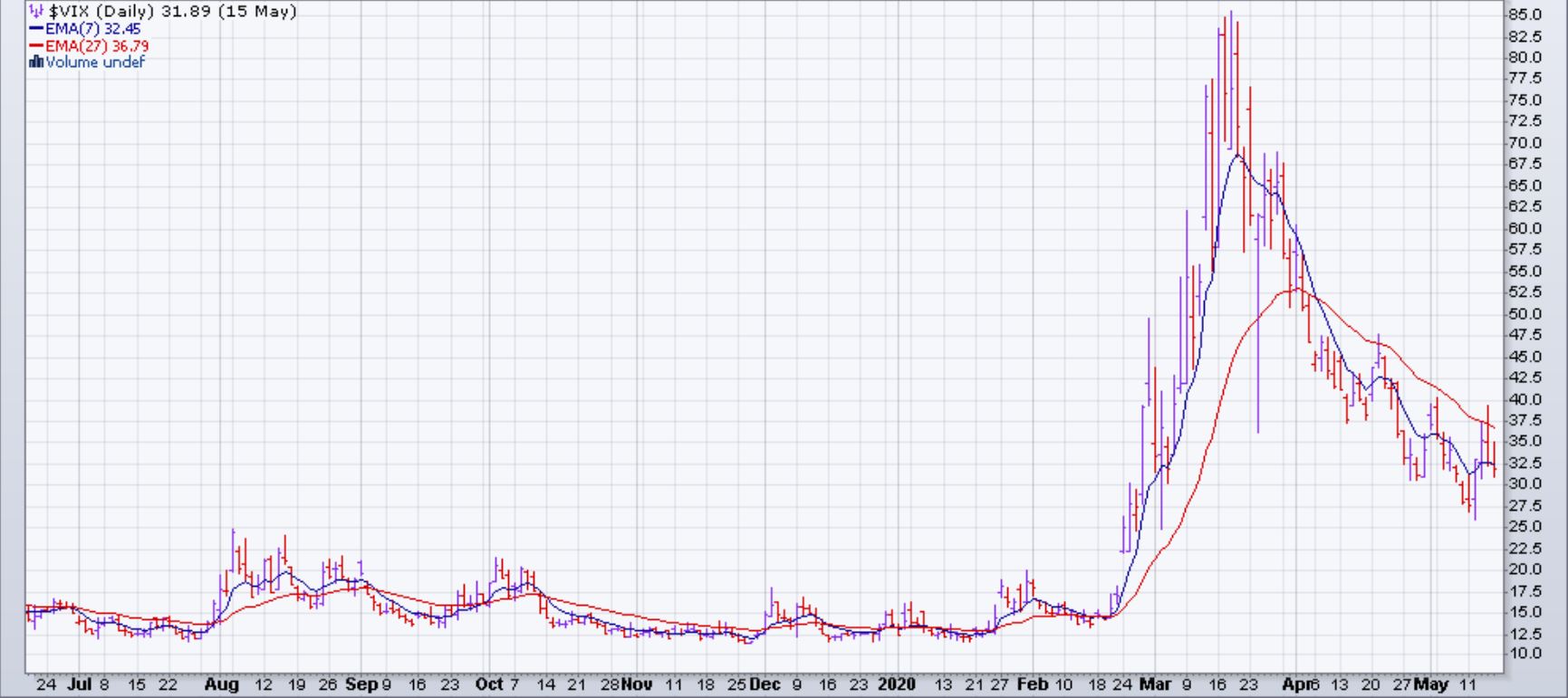Le SPY continu de jouer dans sa congestion de prix entre 270 et 295. Le VIX a arrêté de tomber et ses EMAs se rapprochent.