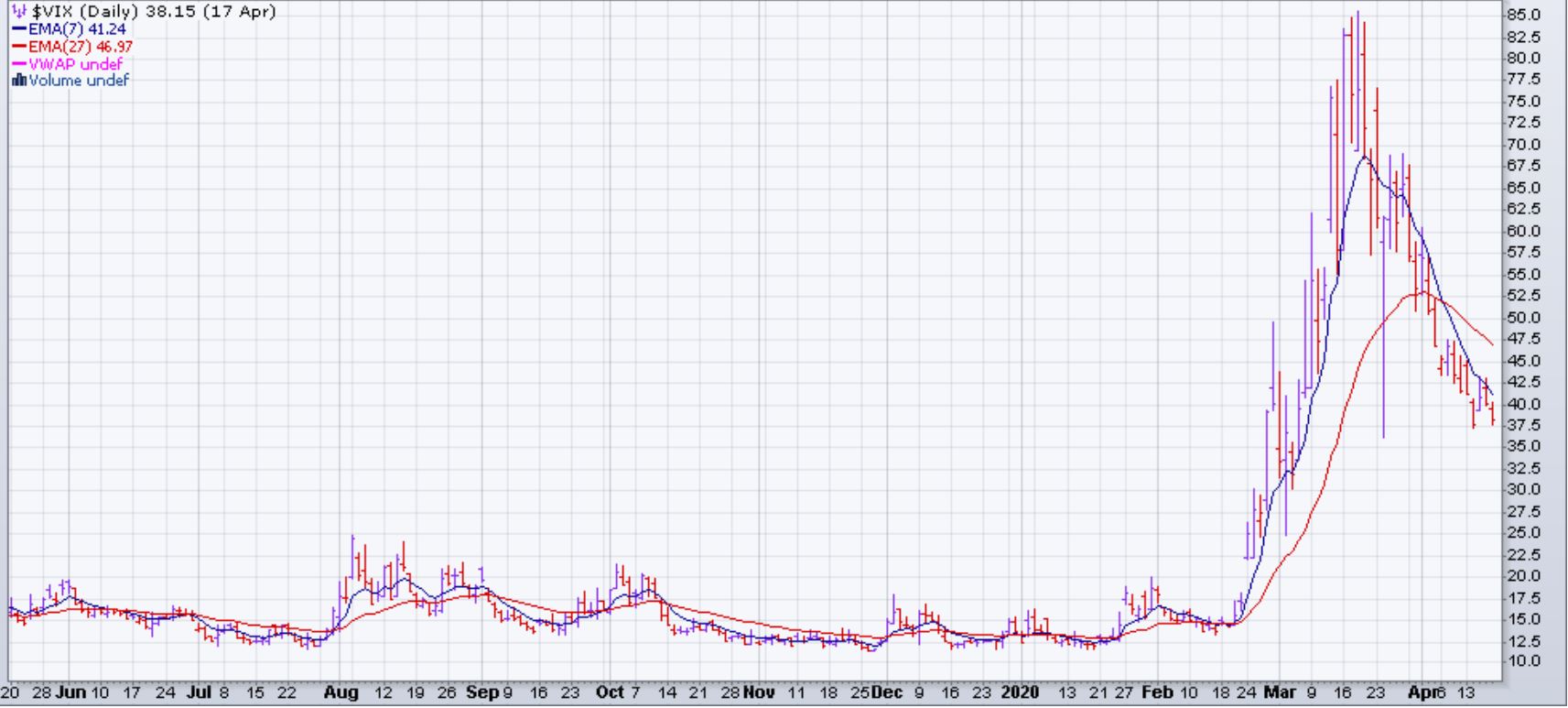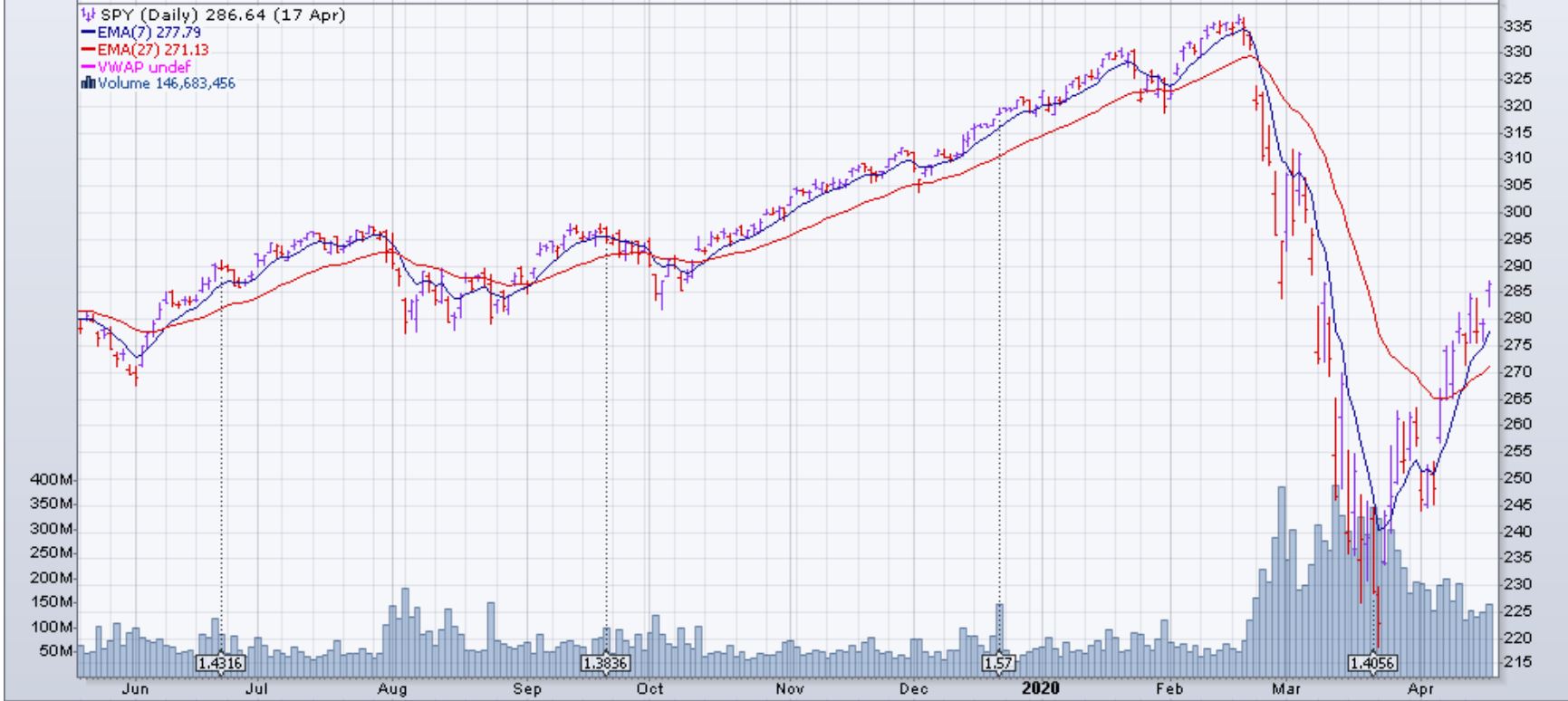 Les moyennes mobiles (EMA 7,27) du SPY, comme prévu, se sont croisés à la hausse la semaine du 13 avril. Le VIX est toujours à des niveaux très hauts, mais au moins ses moyennes mobiles (EMA 7,27) sont à la baisse.