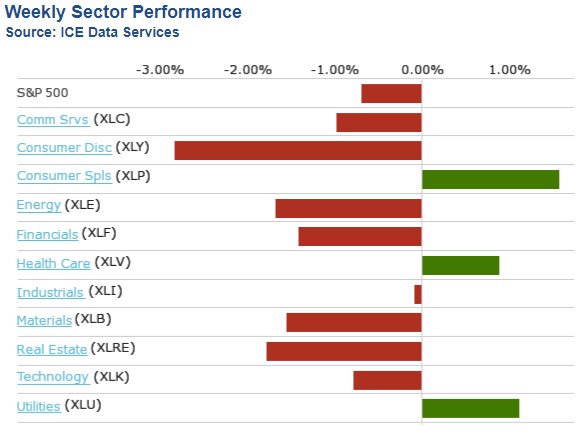 Parmi les secteurs du S&P 500, le secteur de la consommation discrétionnaire a connu la plus forte baisse en pourcentage cette semaine, glissant de 3,1 %, suivi d'une baisse de 2,4 % dans l'énergie, d'une baisse de 1,8 % dans l'immobilier et d'une baisse de 1,6 % dans les matériaux. Cependant, trois secteurs ont réussi à afficher des gains : les biens de consommation de base ont augmenté de 1,7 %, suivis d'une hausse de 1 % dans les soins de santé et d'une hausse de 0,8 % dans les services publics.