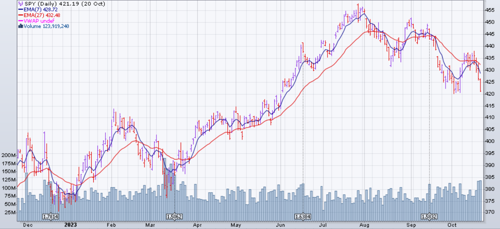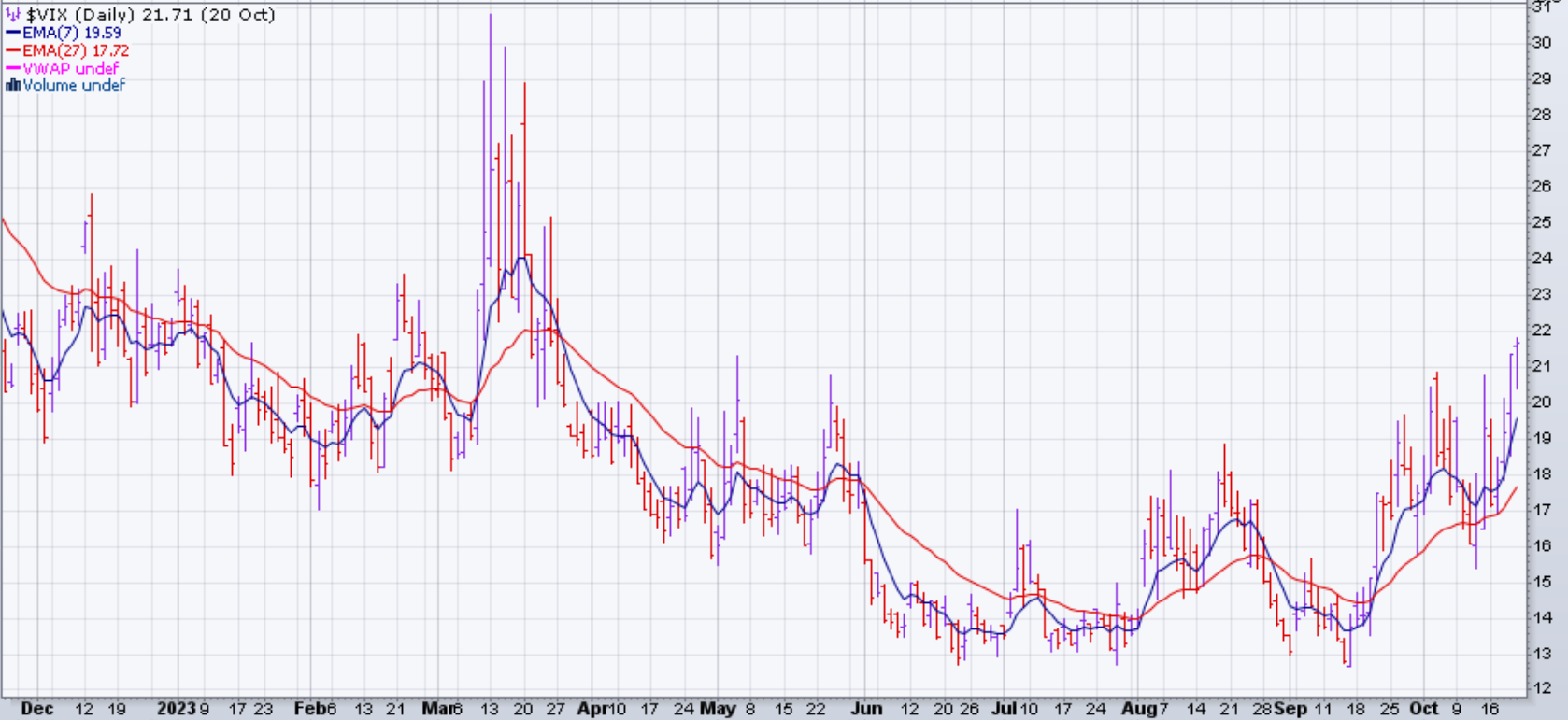 Le marché (SPX et dérivés) est descendu de 2.4% la semaine du 16 octobre 2023. Il s'agit de la première baisse hebdomadaire de l'indice depuis la dernière semaine de septembre. Il est désormais en baisse de 1,5 % pour le mois depuis le début, mais reste solidement en territoire positif pour 2023 avec un gain de 10 % depuis le début de l'année.