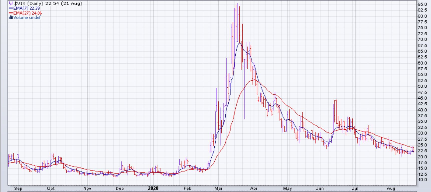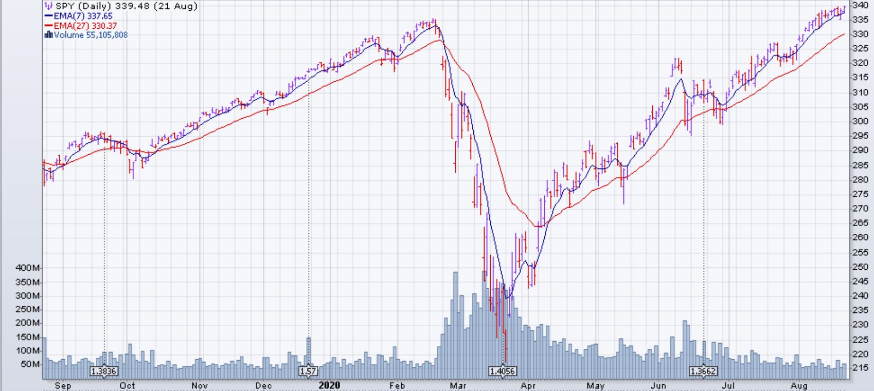 Le SPY continue sa montée, mais encore une fois montre des faiblesses dans sa force à la hausse. Le volume global de marché continue de baisser, mais cela peut être dû aux semaines d'août qui historiquement sont plus calmes à cause des vacances. Le VIX a conclu sa semaine au même niveau de la semaine précédente (22.54%).
