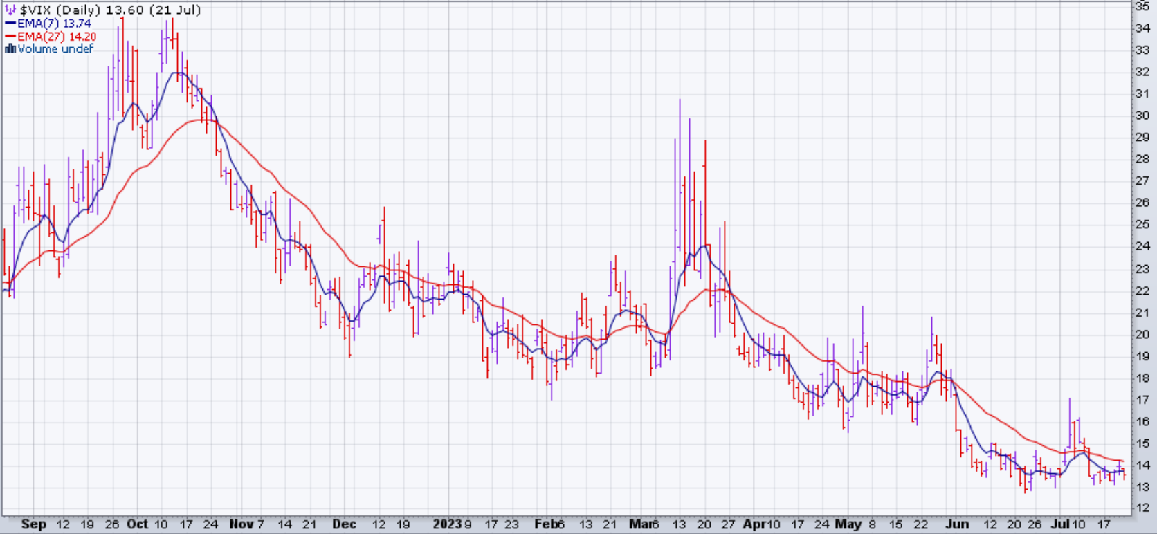 Le VIX a conclu se semaine à 13.6%: un niveau qu'il a fait plusieurs fois depuis un mois. Ce niveau montre que le pessimisme parmi les investisseurs diminue.
