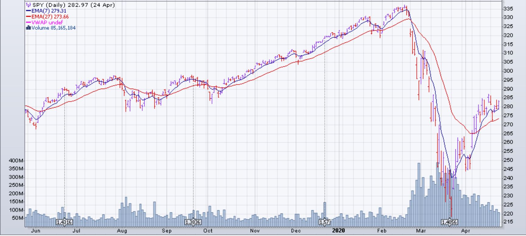 Le SPY montre de la timidité dans sa montée et semble être dans une congestion depuis quelques jours. Le VIX (index de la volatilité) est descendu la semaine du 20 avril et a atteint le niveau le plus bas depuis mars.